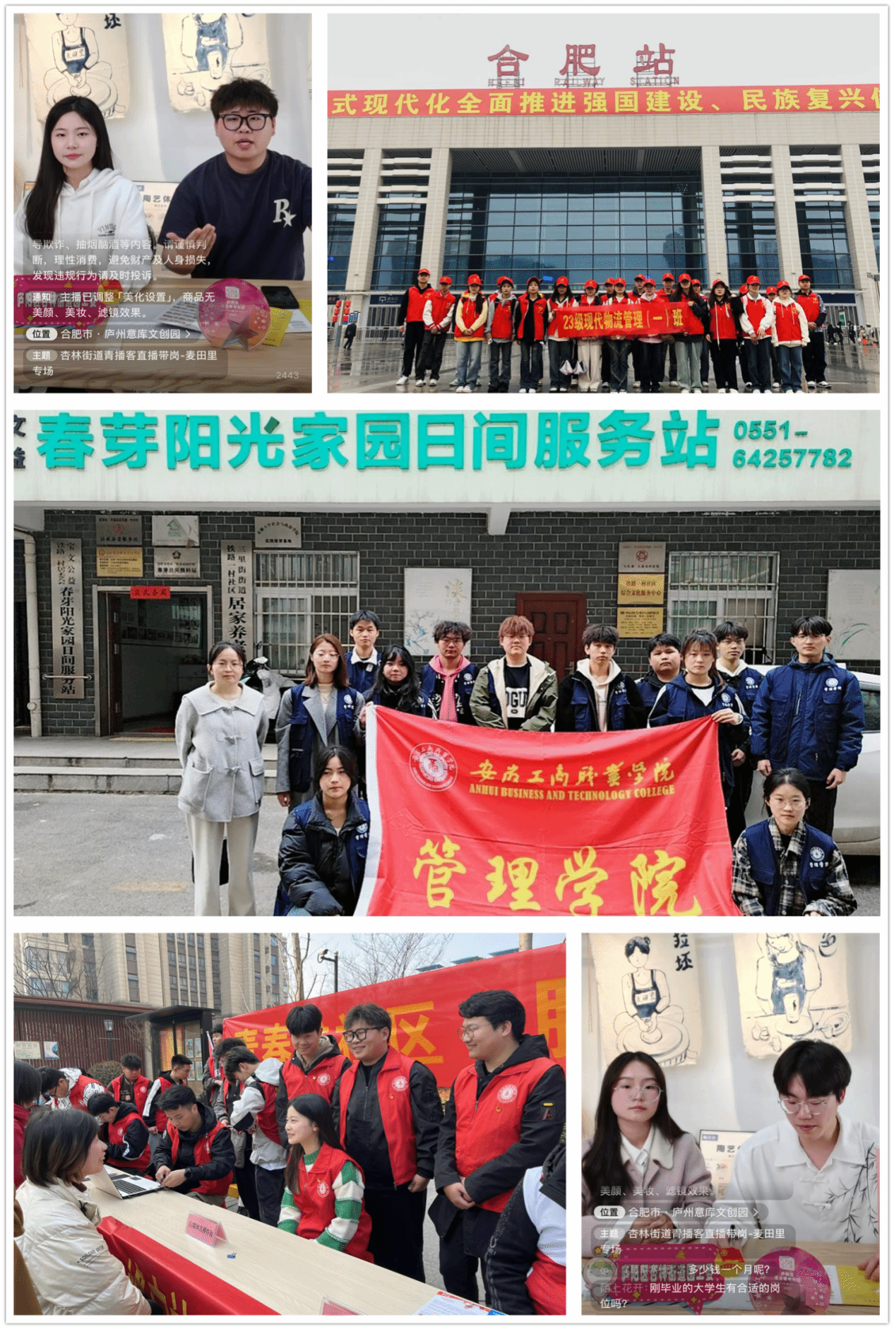 走出校园走进社区,志愿服务展示风采。学院积极开展校外实践活动,引导青年学生将理论知识学习内化于心、外化于行。3月14日,管理学院13名师生志愿者前往合肥市春芽残疾人互助协会阳光家园日间服务站,为弱势群体送去陪伴和关爱。3月15日,在校团委的统一组织下,学院电子商务专业的4名志愿者走进弘阳时光里小区为前来咨询自媒体直播的居民答疑解惑,帮助广大居民更好地把握自媒体带来的机遇。3月17日,学院近30人的志愿服务团队在合肥市火车站开展志愿服务活动,他们积极细心地询问乘客的需求,耐心地解答出行问题,为旅客提供贴心、舒心、安心的暖心服务。3月22日,学院电子商务和网络营销与直播电商专业的学生们为杏林街道辖区企业开展了一次直播带岗志愿服务活动,受到广泛好评。