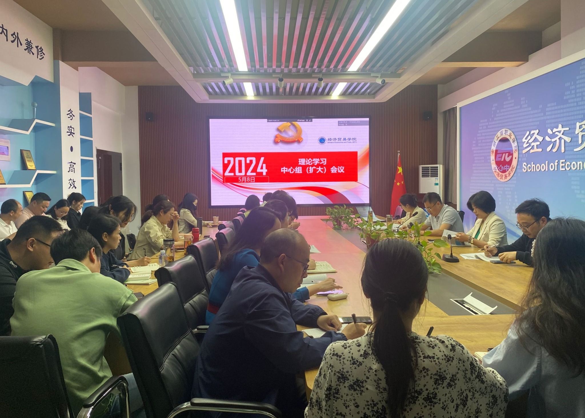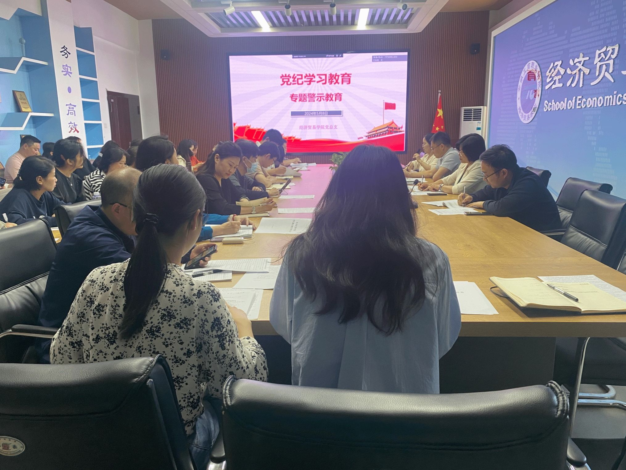 为深入学习贯彻习近平总书记关于党纪学习教育的重要讲话和重要指示精神,认真落实学校党委党纪学习教育工作的部署要求,5月8日中午,经济贸易学院党总支在5楼教师能力提升中心召开理论学习中心组学习(扩大)会议暨党纪学习教育专题会议,会议由党总支书记边昊主持,全体教职工参加会议。