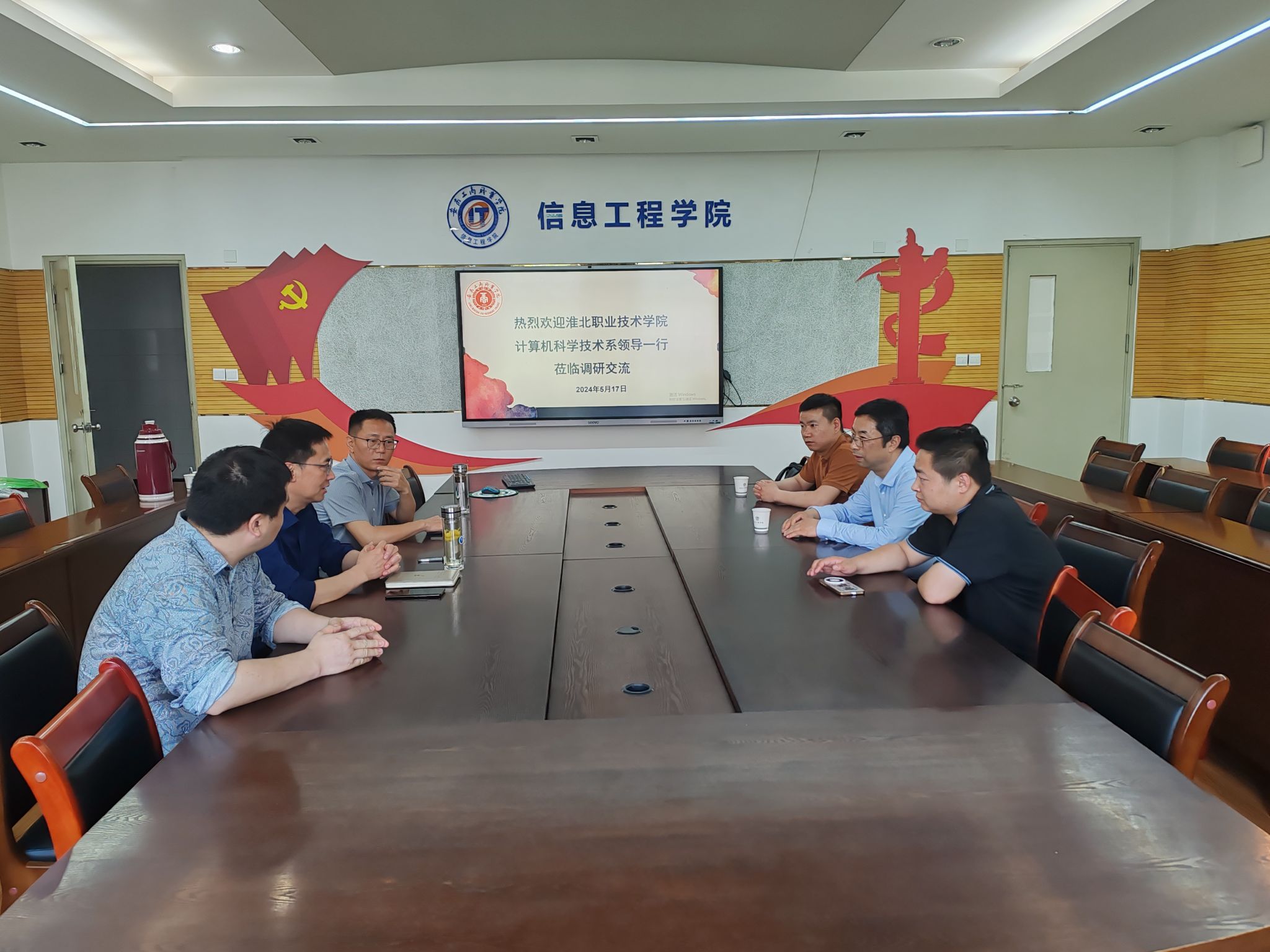 5月17日下午,淮北职业技术学院计算机科学技术系主任宫纪明一行来我校信息工程学院调研交流。信息工程学院院长范生万、教研室主任茹兴旺等老师热情接待并参加交流活动。