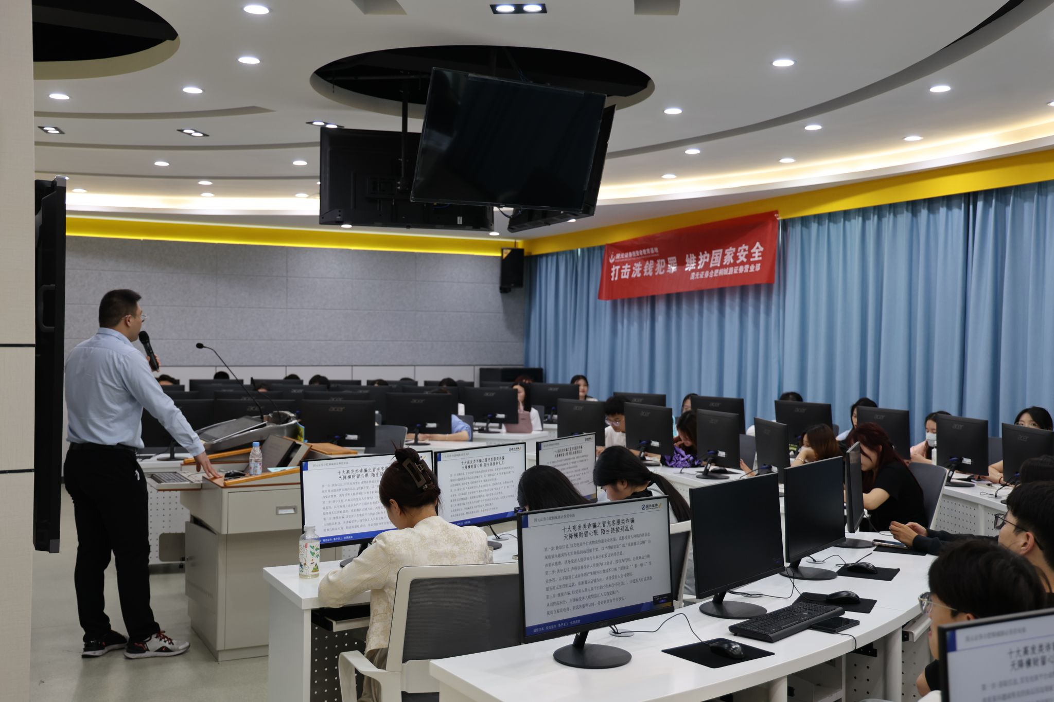 为增强大学生金融风险防范意识、掌握必备金融知识、增强自身金融综合素质、切实保障学生群体财产安全,2024年5月22日下午,经济贸易学院联合国元证券投资者教育基地,在我校投资理财实训室共同开展了“金融反诈进校园 筑牢反诈安全墙”知识讲座,金融服务与管理专业共计60余学生参加活动。