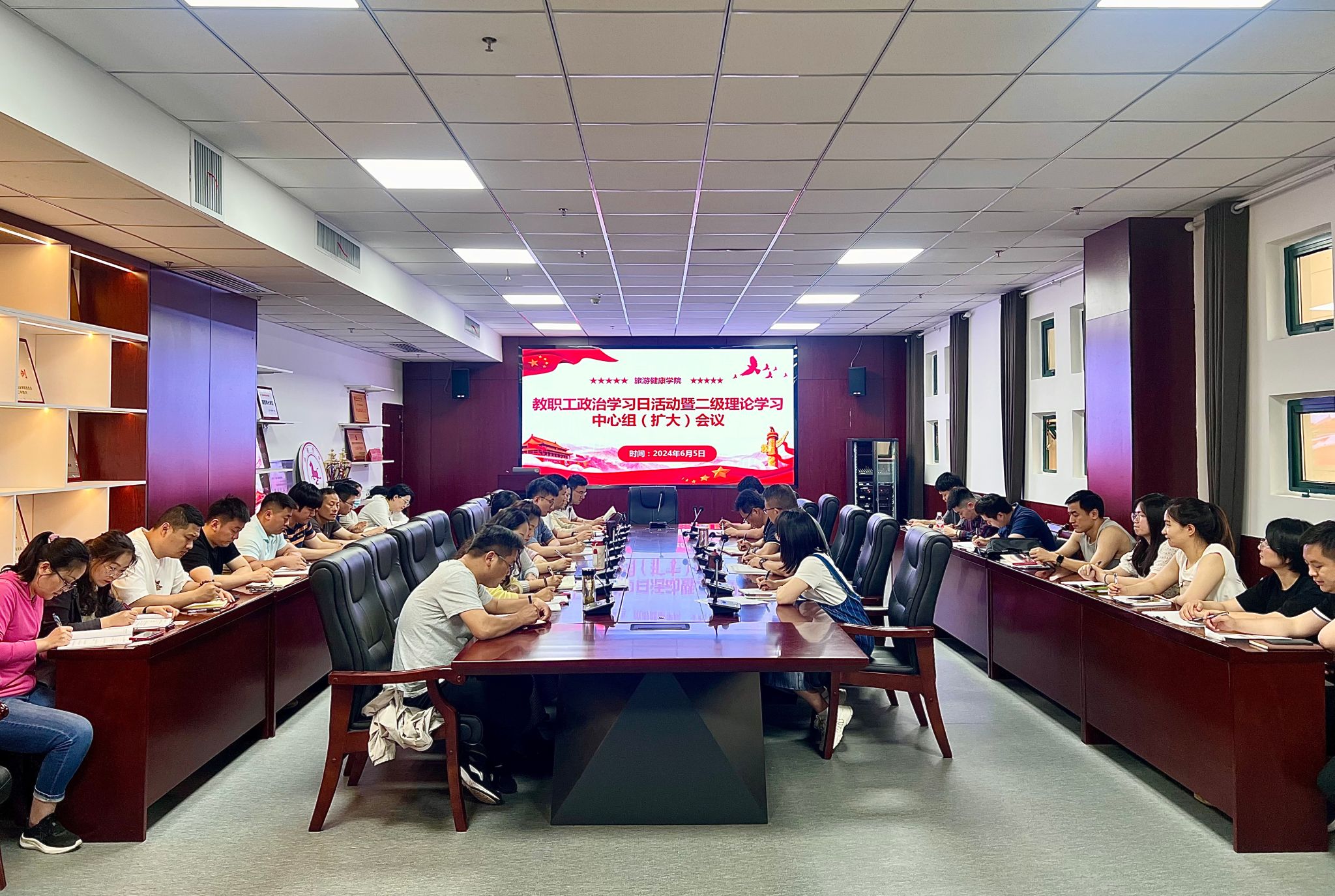 6月5日下午,旅游健康学院党总支在学院会议室召开二级理论学习中心组(扩大)学习暨教职工政治理论学习会议,会议由党总支书记杨锐主持,全体教职工参加会议。