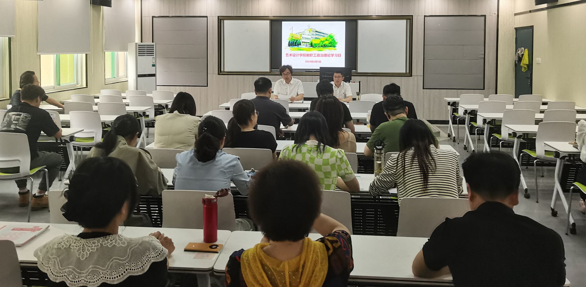 6月5日中午,艺术设计学院党总支在致知楼Z204智慧教室召开六月份教职工政治理论学习会议,学习习近平总书记在山东考察时的重要讲话精神、习近平总书记关于党的自我革命的重要思想、习近平总书记关于党纪学习教育的重要讲话和重要指示精神,并开展《中国共产党纪律处分条例》学习。校党委委员、党委宣传统战部部长、艺术设计学院党总支书记孔成,艺术设计学院党总支副书记张乐及全院教职工参加学习。