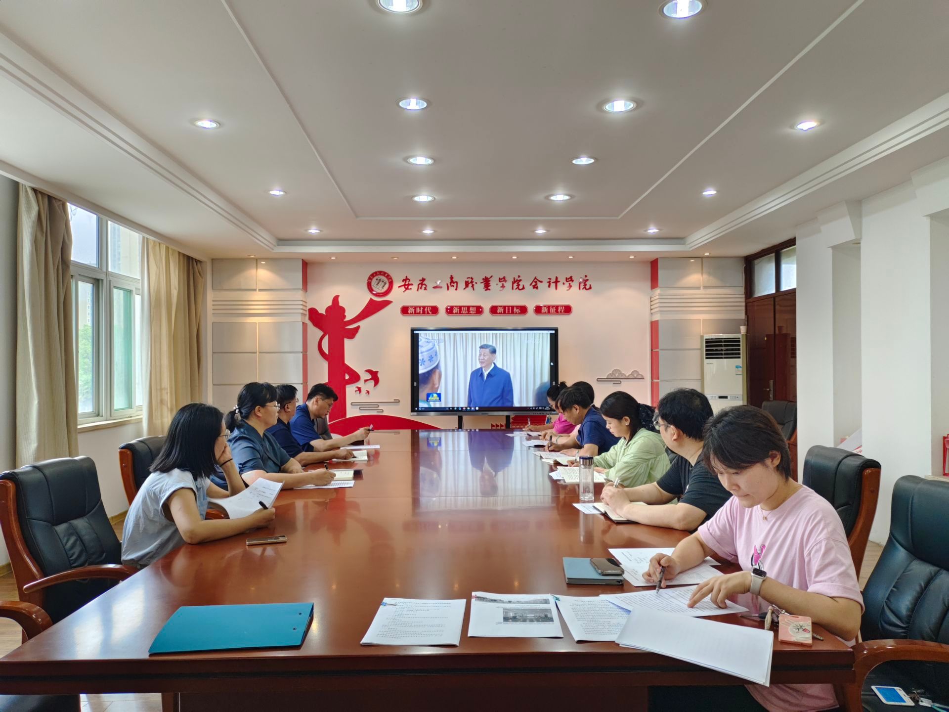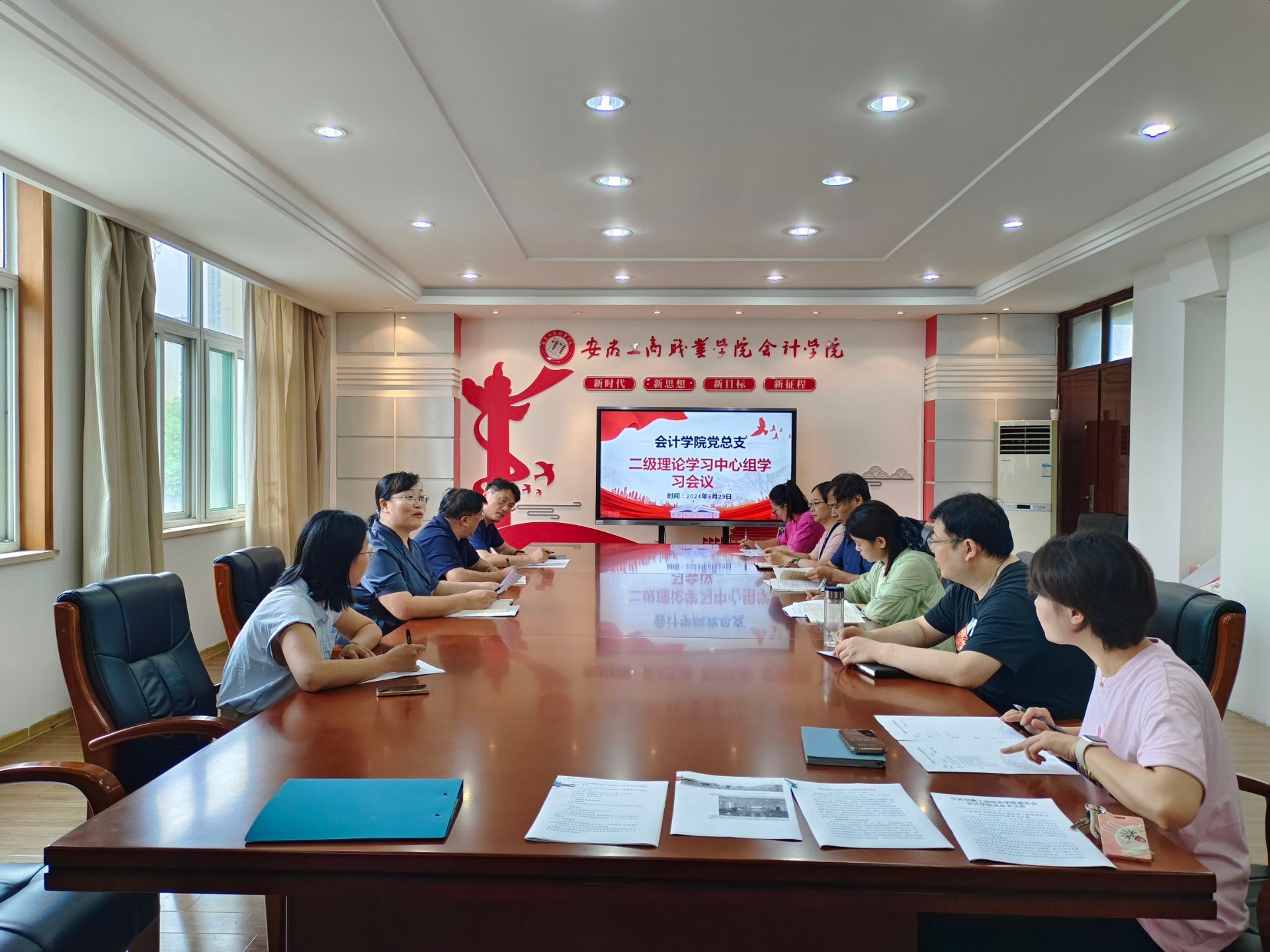 2024年6月29日上午,会计学院党总支在明德楼二楼党建会议室召开了二级理论学习中心组学习会议。本次会议由党总支书记赵艳同志主持,校党委宣传统战部、组织人事处组成工作组到会旁听列席,学院全体党总支委员参与学习。