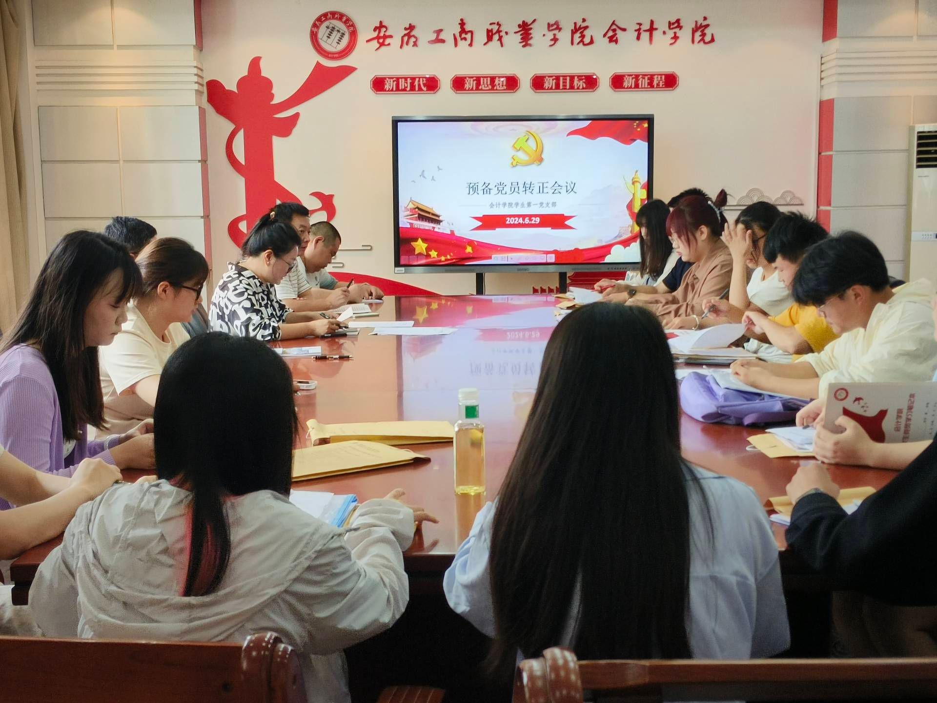 根据学校党委关于党员发展工作的整体部署,经过会计学院党总支的预审同意,我院学生党支部于6月29日在党建会议室及教学楼教室召开预备党员转正支部大会。此次大会主要审议王雨洁等41位同志由预备党员转为中共正式党员的事宜,旨在对他们预备期内的表现进行全面回顾与审查。