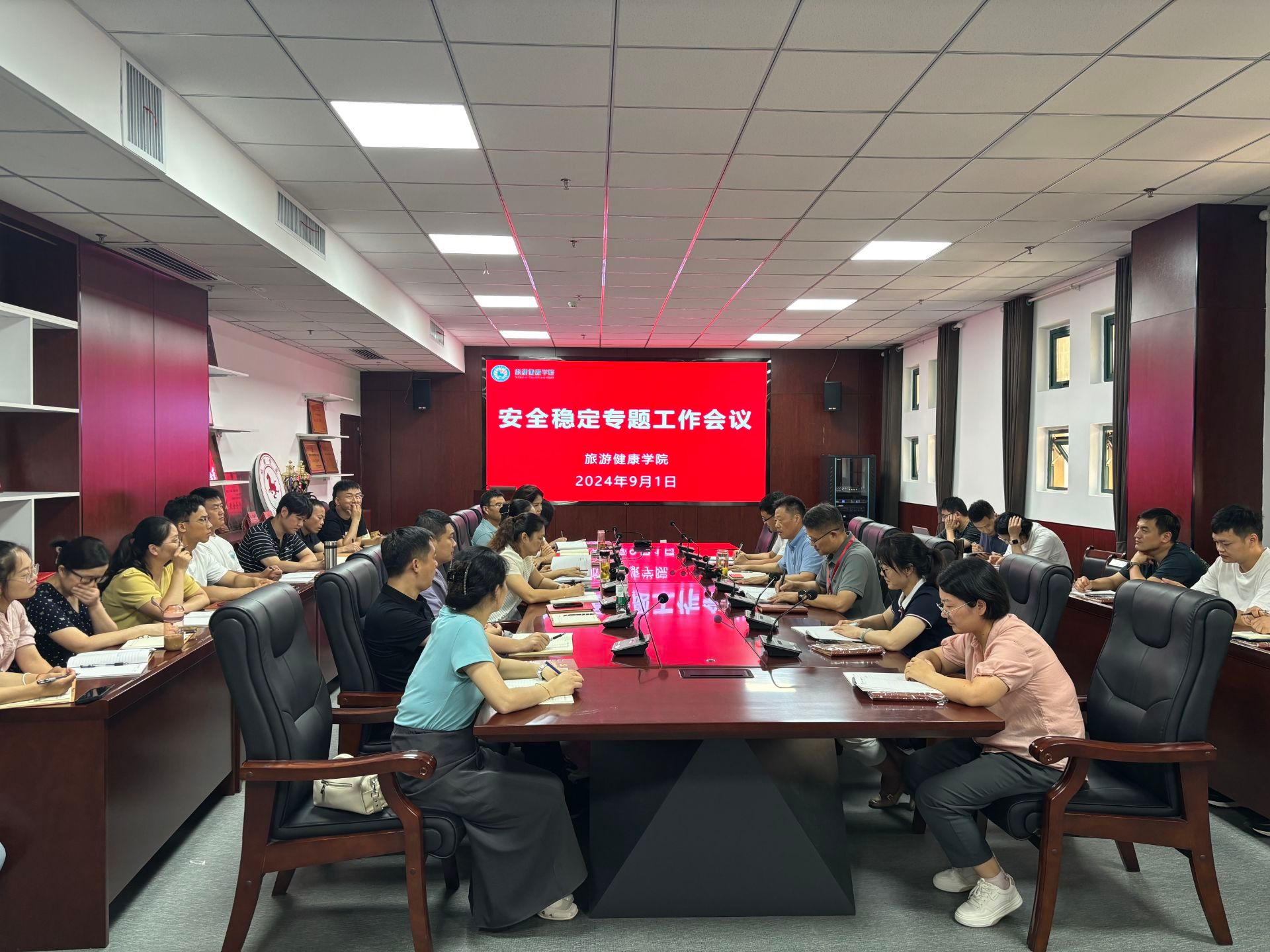 9月1日中午,旅游健康学院在学院会议室召开新学期安全稳定专题工作会议。学院全体教职工参会,会议由院长傅绪明主持。