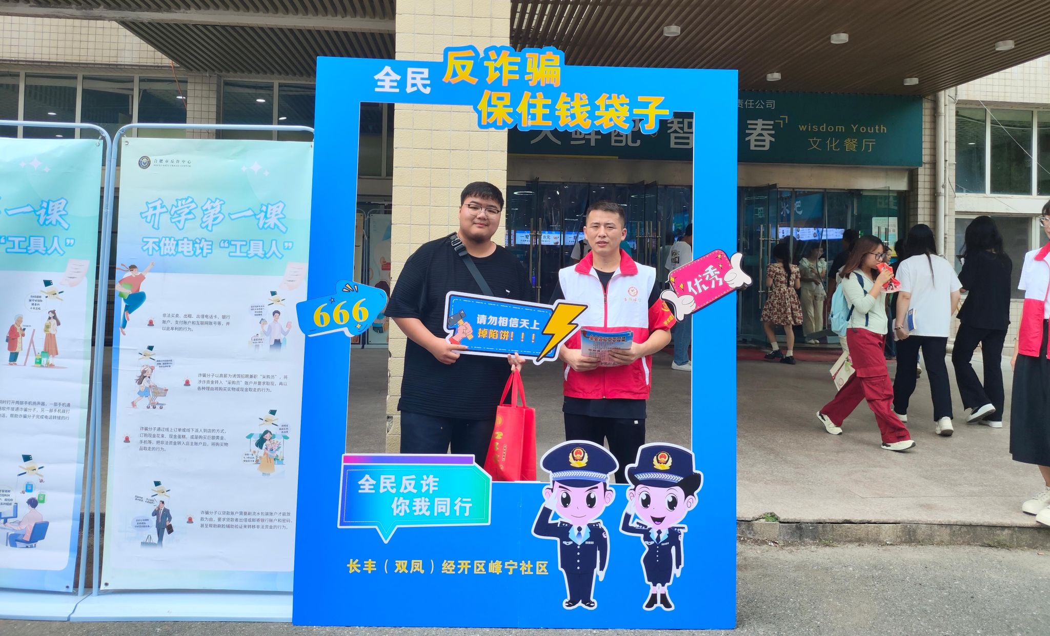 新学期伊始,为坚决遏制电信网络诈骗高发趋势,保障师生财产安全,2024年9月2日,保卫处联合双凤开发区峰宁社区工作人员组织开展了“全民反诈骗,保住钱袋子”宣传活动。