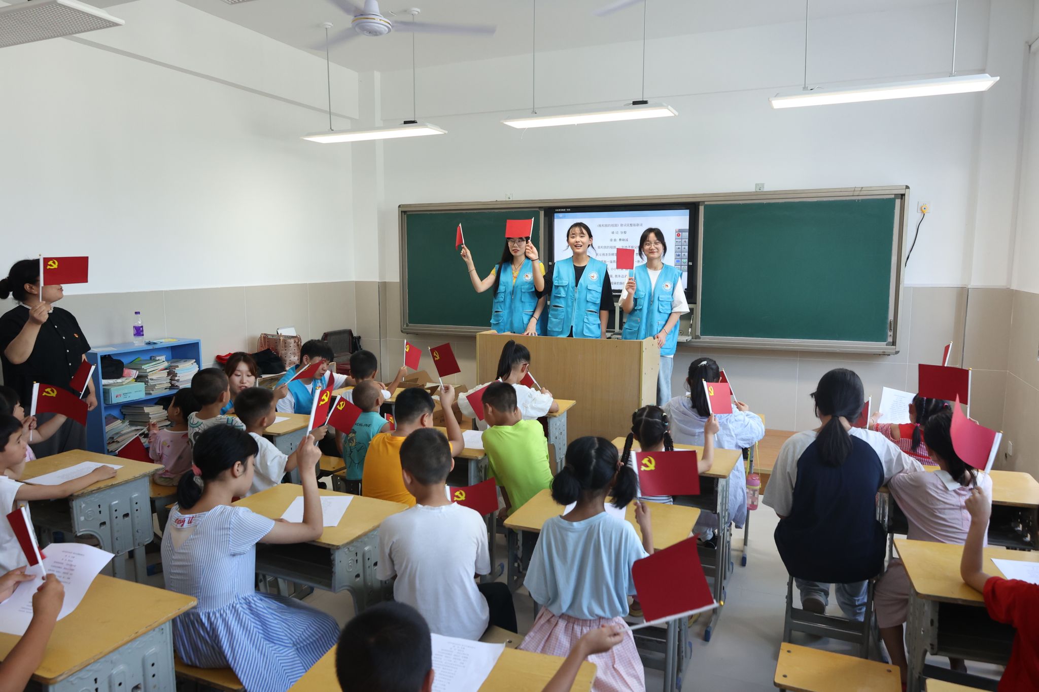 红色歌曲蕴含着深厚的爱国主义情怀,志愿者和小朋友们手举小党旗一起合唱《没有共产党就没有新中国》,共同庆祝新中国成立七十五周年,让爱国精神在孩子们心中生根发芽。整个活动现场气氛热烈,掌声不断,孩子们在轻松愉快的氛围中接受了一次深刻的红色教育。每一个音符都抒发着心中的骄傲与自豪,每一句歌词都激励着大家积极向上、奋发有为。歌以传情,歌以咏志,让孩子们通过红色歌曲,在艺术教育中接受熏陶洗礼,引导孩子们坚定理想信念,传承红色基因,争做时代新人。