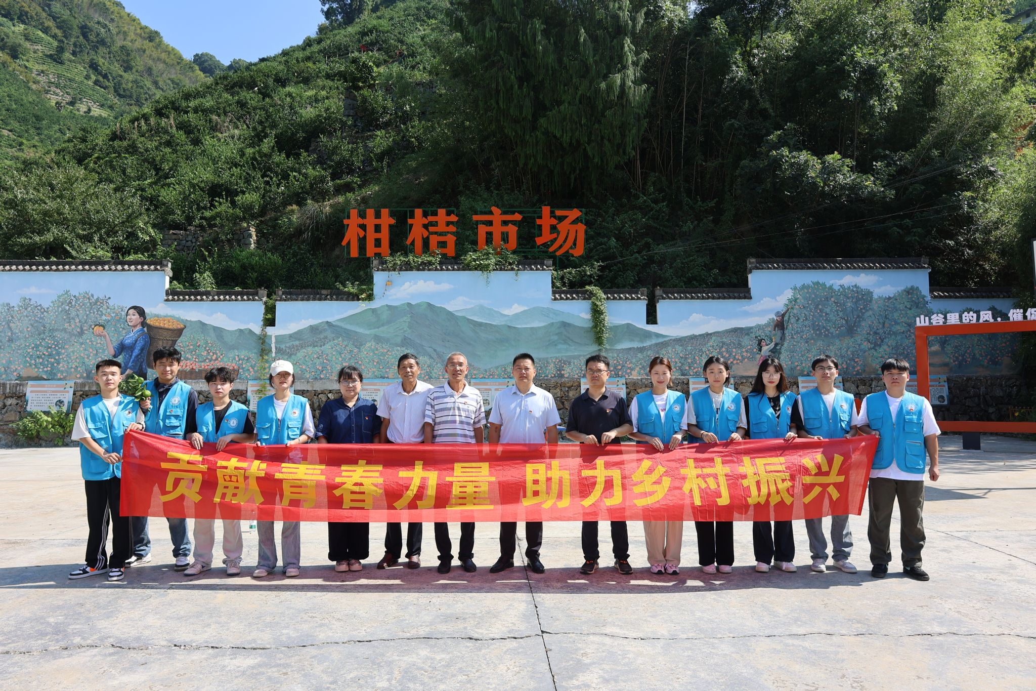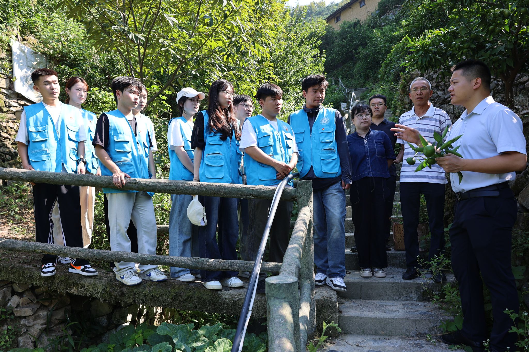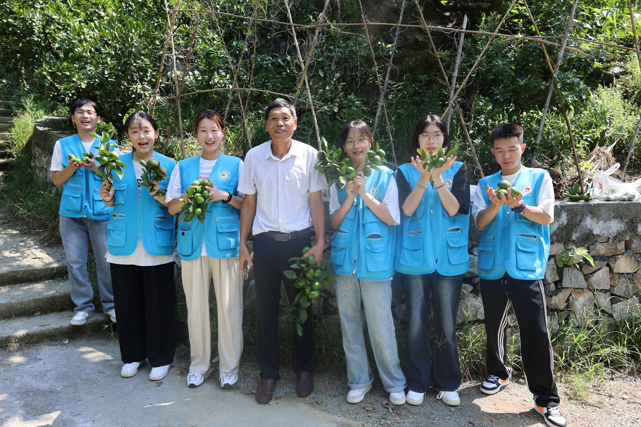 眼下,在安徽省黄山歙县新溪口乡塔坑村橘园,漫山遍野的柑橘树映入眼帘,青绿色的柑橘缀满枝头,长势喜人。一群身着蓝马甲的少年奔赴橘林,化身小农民在新溪口乡乡长江伟和柑橘合作社长余生明的带领下,他们深入柑橘林中,拿好除草工具,清理田间的杂草,汗水湿透了他们的衣衫,但他们手上的动作没有慢下来,尽管橘林坑坑洼洼,实践团队成员个个兴致勃勃,互相协作,一派忙碌的景象。