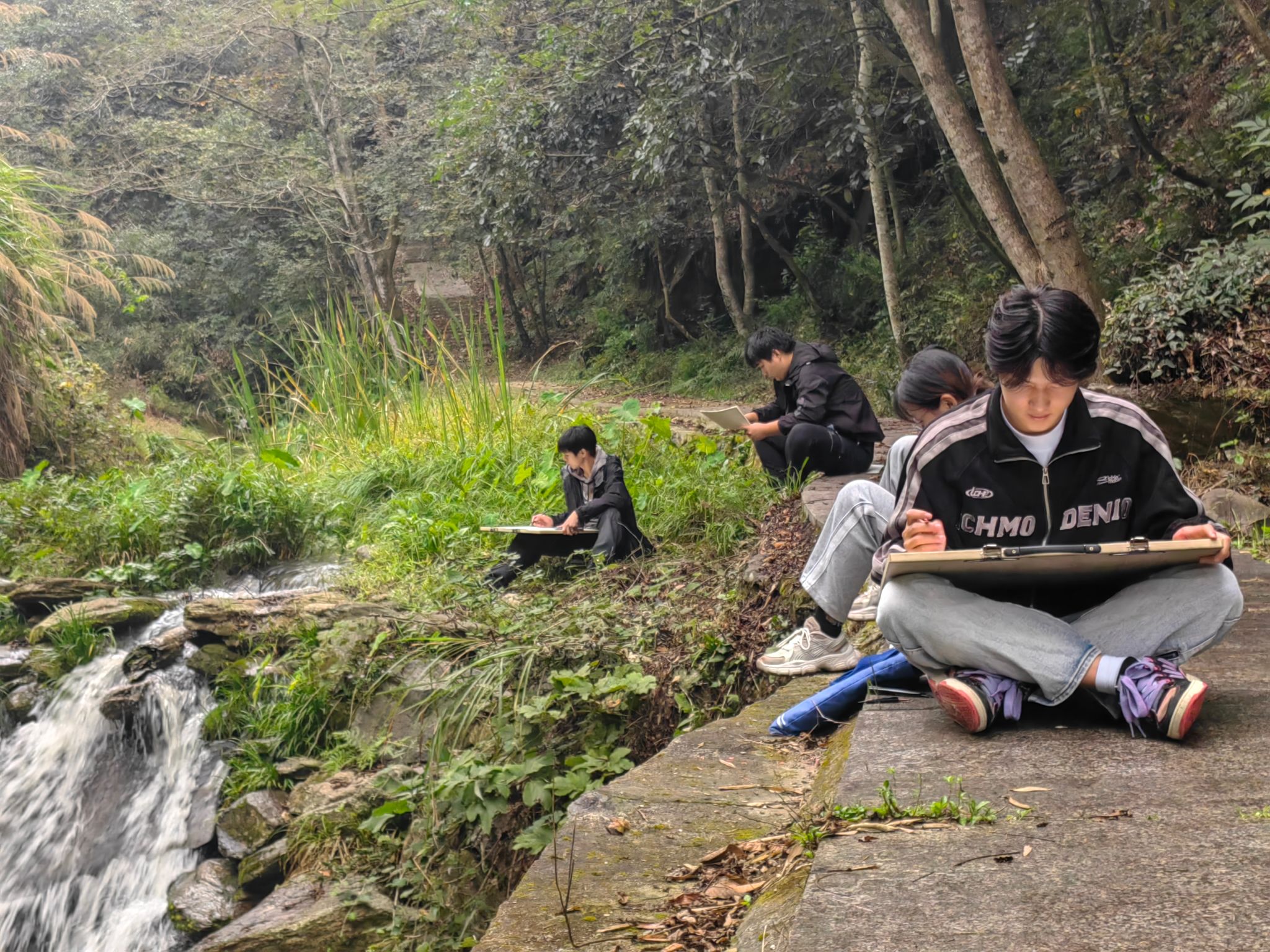 在胡多军书记的带领下,师生团队考察了村里附近的九井溪、龙潭谷、仙人瀑布等著名景区。面对如此美景,同学们纷纷拿出画笔和手机,不仅用手中的画笔描绘着眼前的美景,也通过手机镜头记录下了大龙村独特的自然风光。