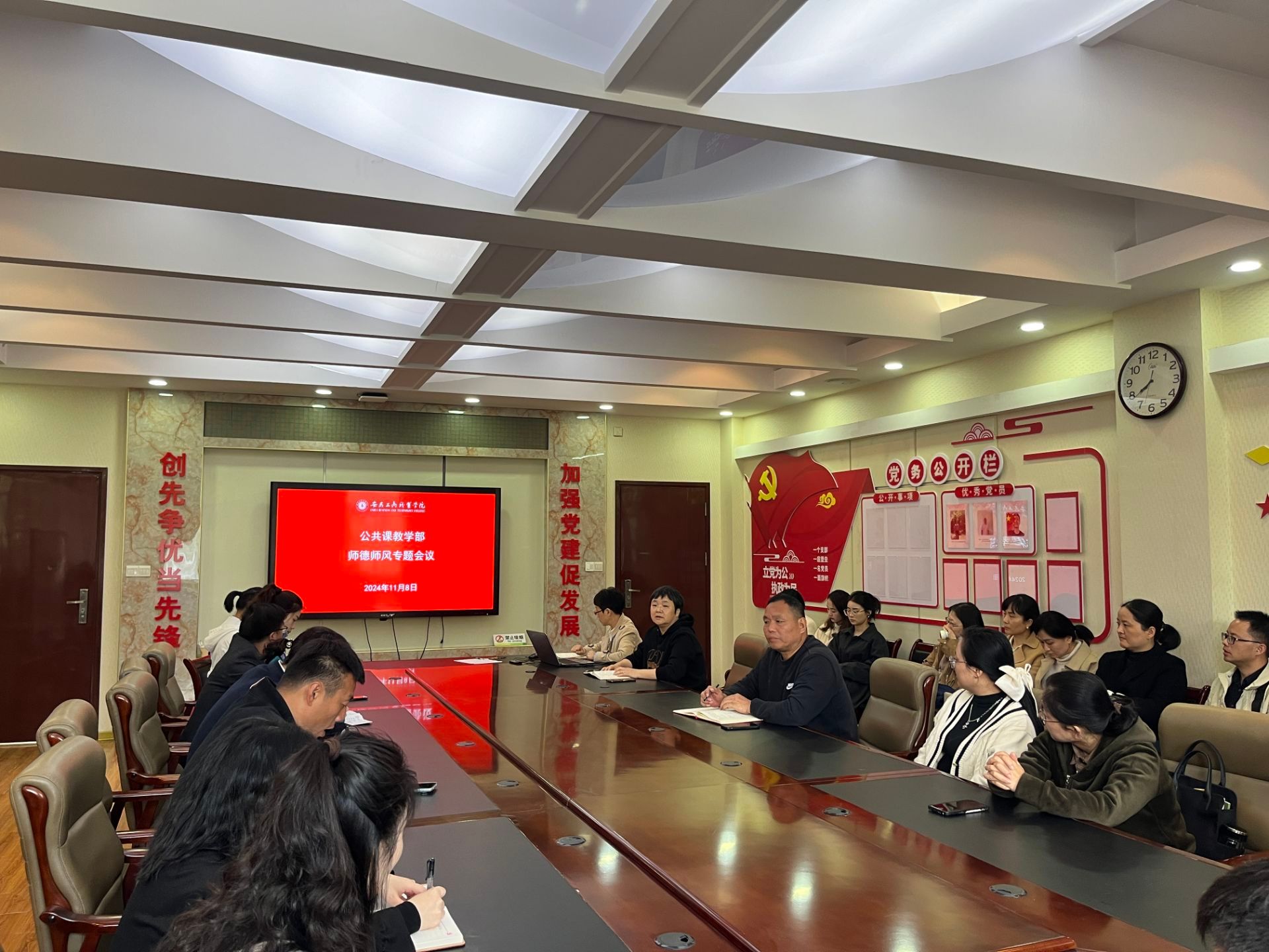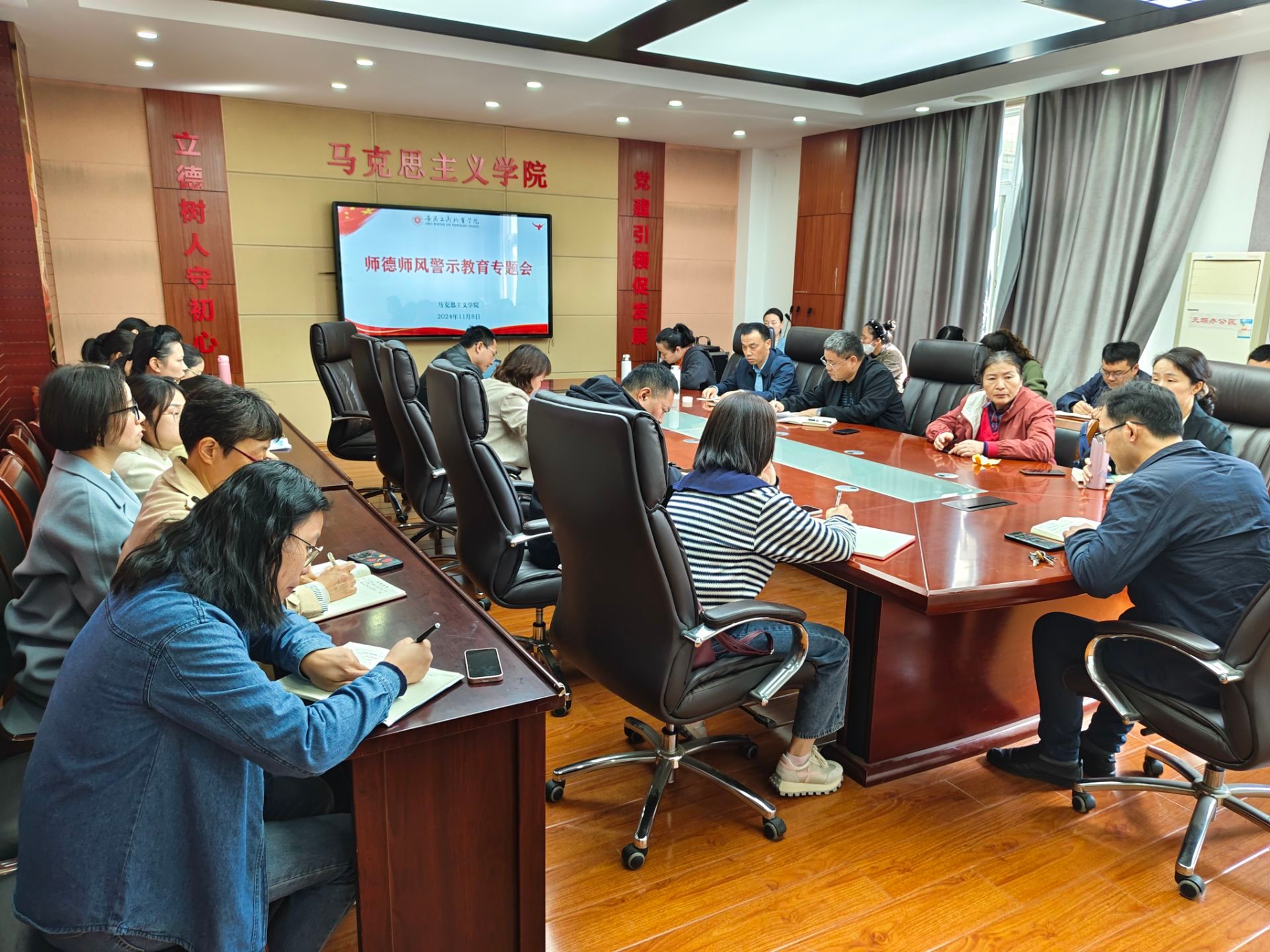 为深入贯彻党的教育方针,积极响应习近平总书记关于加强师德师风建设的重要指示,进一步提升教师职业道德水平,11月8日中午,马克思主义学院党总支召开了师德师风专题会议,全体教职工参会。