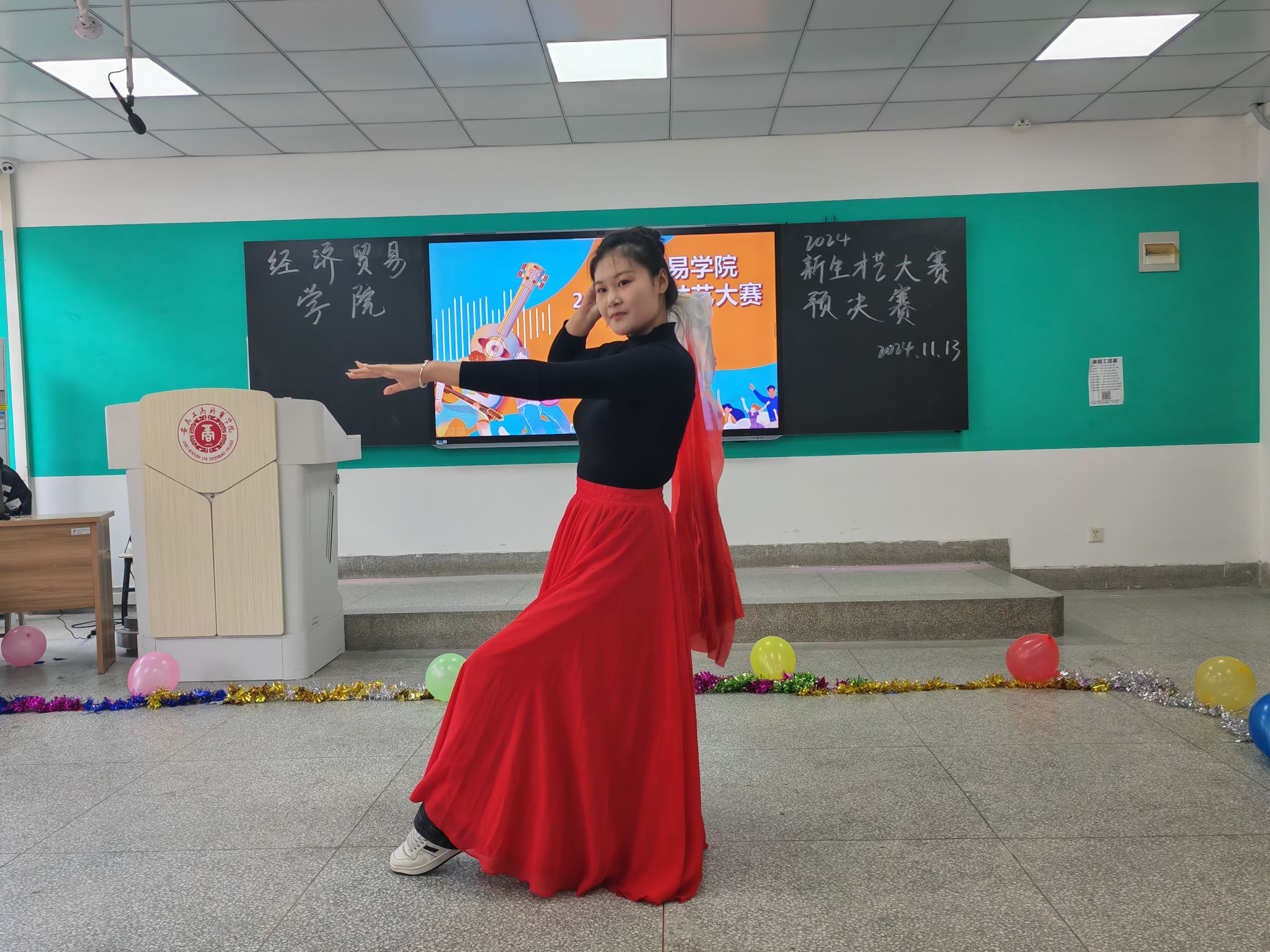 韶华不负启新程,青春作笔书华章;为丰富大学生校园文化生活,给新生提供一个展示自我、施展才华的舞台,促进彼此之间的交流与融合,11月14日经济贸易学院在B205教室举行“怦然‘新’动,‘才’华横溢”——新生才艺大赛,学院团总支书记邬金,辅导员朱清涟、支凤宁、刘雨梅和部分学生干部担任本次比赛评委,学院各专业学生观看了本次新生才艺大赛。