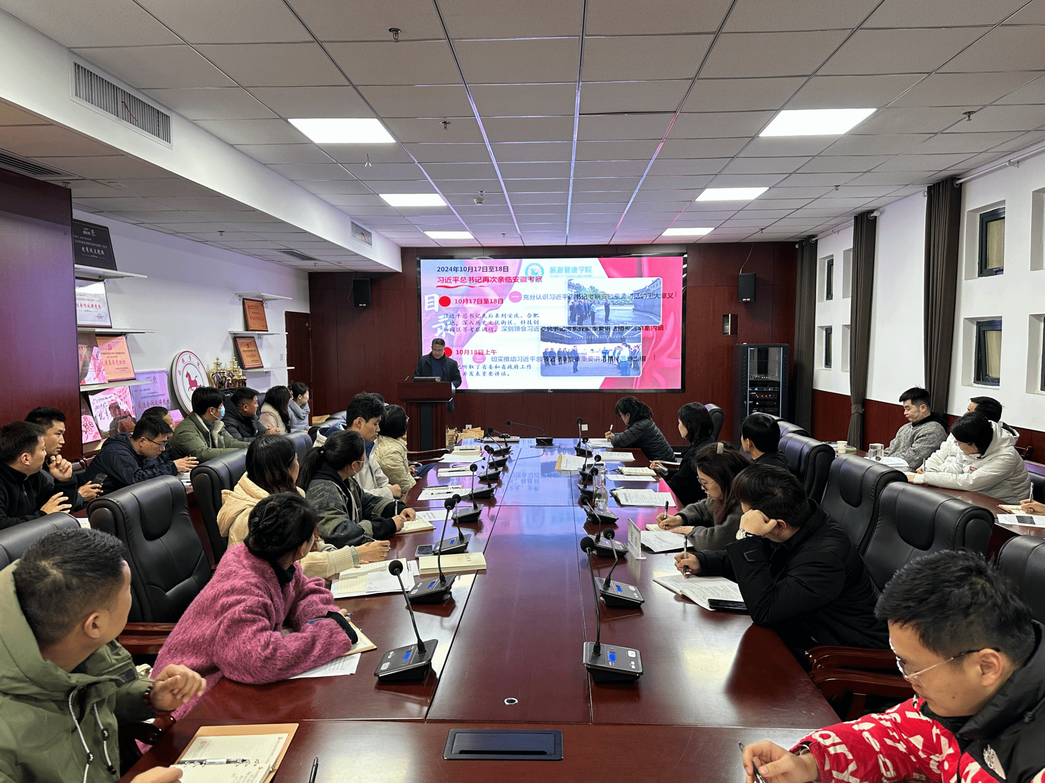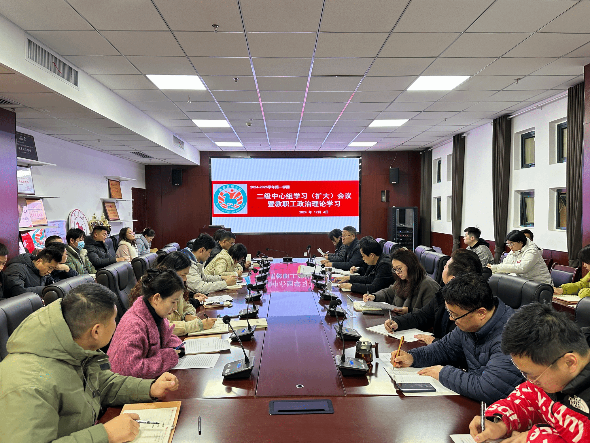 12月4日下午,旅游健康学院党总支在学院会议室召开理论学习中心组学习(扩大)会议暨教职工政治理论学习,会议由党总支书记杨锐主持,全体教职工参加会议,校党委委员、纪委书记吴松飞到会指导,党委宣传统战部郭玉皖、组织人事处童菲列席会议。