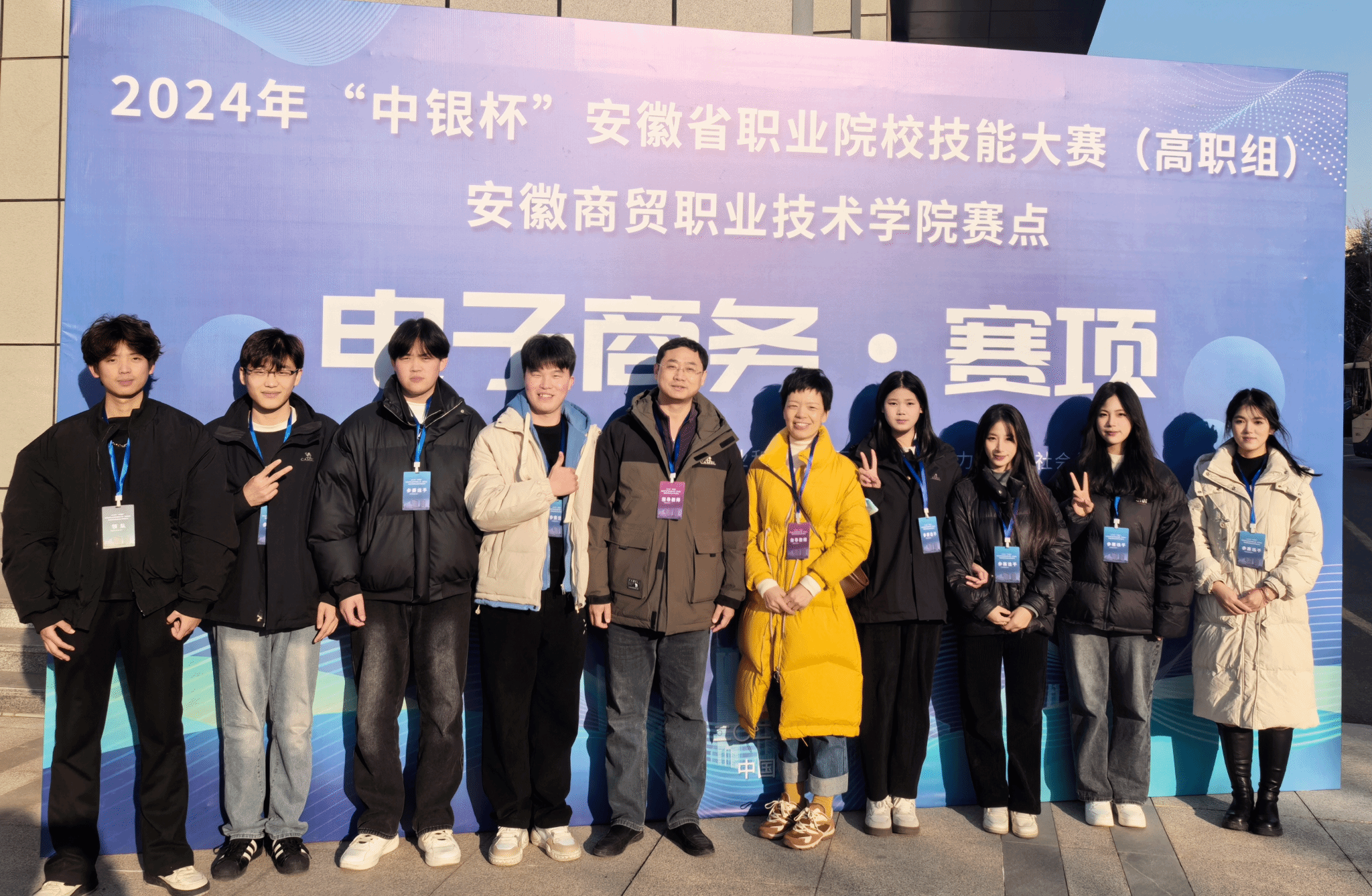 1月11日,在安徽商贸职业学院举行的2024 年“中银杯”安徽省职业院校技能大赛(高职组)电子商务赛项中,由刘亚男、倪伟、郭晓晨三位老师指导的2支团队(1队:顾亚南、李文烨、彭智伟、苑凯乐、2队:陈静、韩歆妍、孙志成、赵心如)凭借扎实的专业知识、出色的应变能力以及默契的团队协作,在众多强队中脱颖而出,双双斩获一等奖。