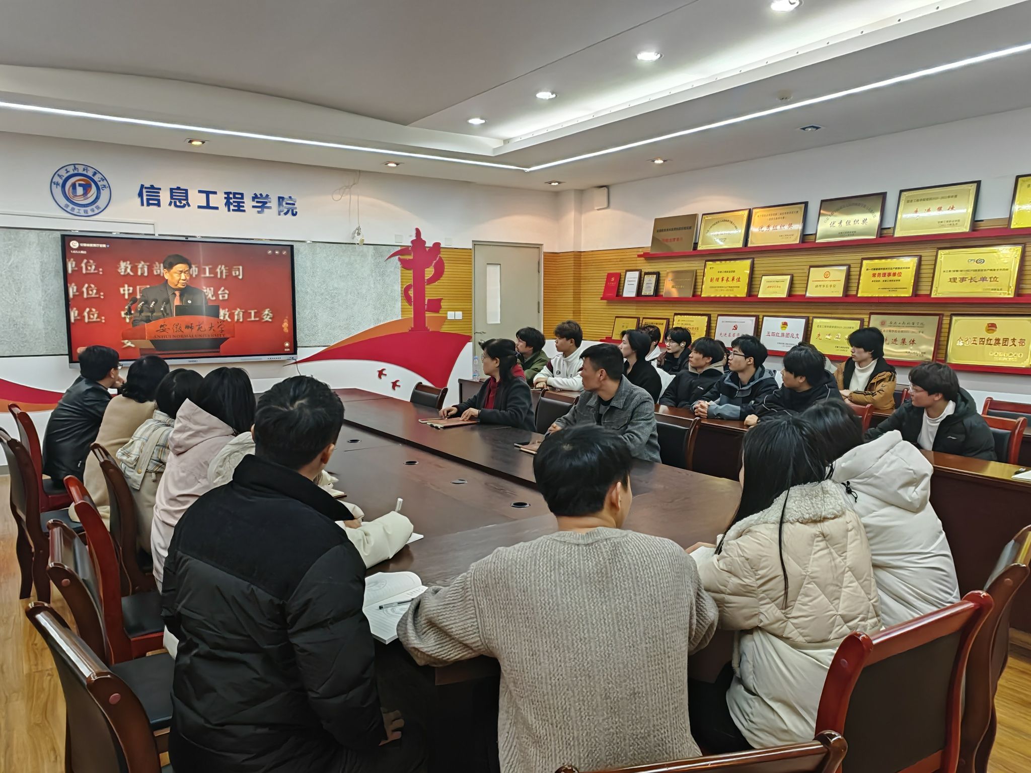 2025年2月27日14:00,在信息工程学院307会议室,全体行政坐班教职工以及部分学生代表,共同参与组织观看由教育部教师工作司主办的全国优秀教师代表“教育家精神”2025 年巡回宣讲(安徽)直播视频,此次活动旨在深入学习贯彻落实习近平总书记关于大力弘扬教育家精神的重要指示,激励广大教师自觉践行教育家精神,凝聚投身教育强国建设的强大合力。