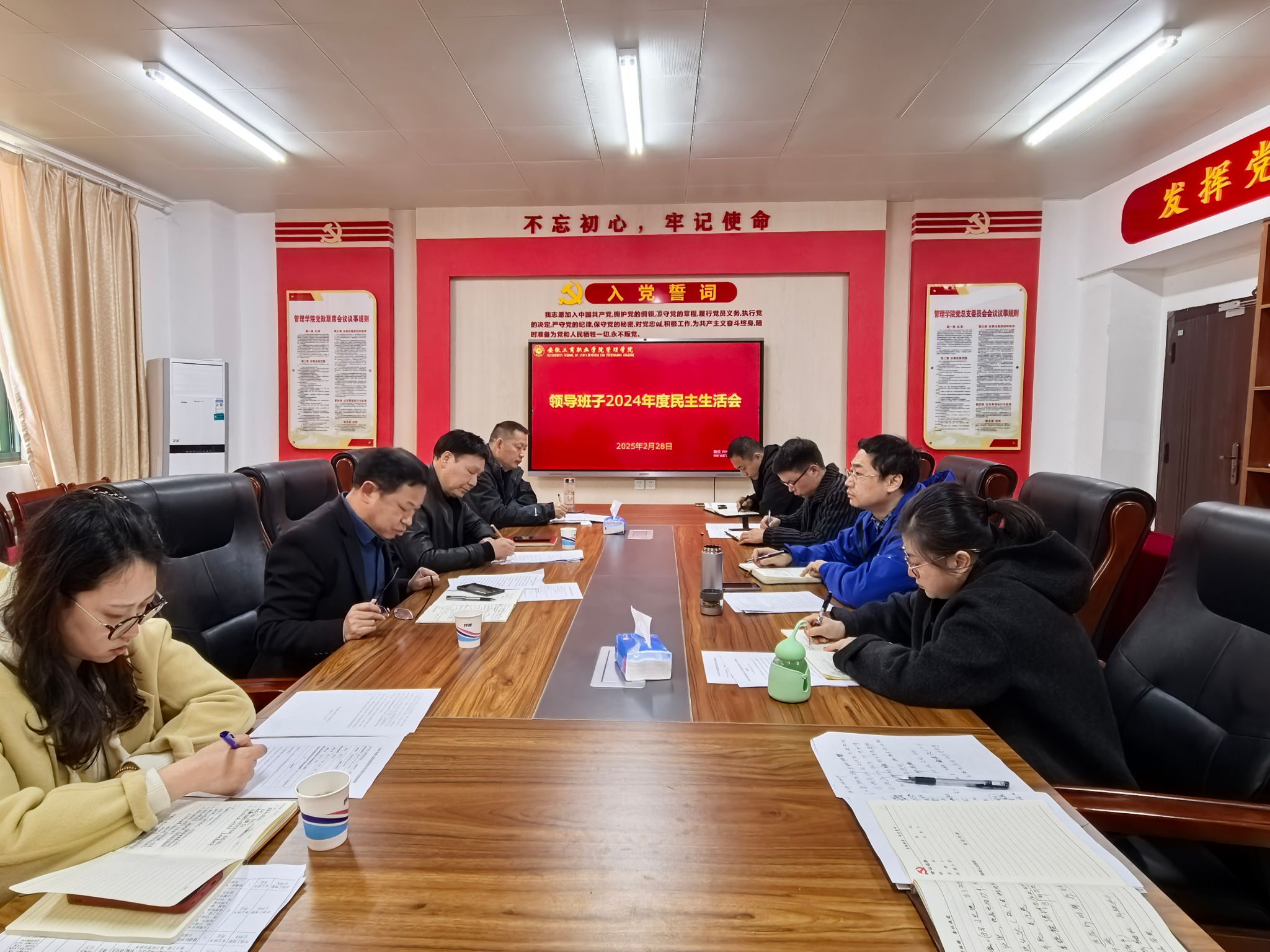 按照学校党委统一部署安排,2月28日,管理学院于学院党员活动室召开2024年度民主生活会。本次民主生活会严格落实上级党委要求,聚焦会议主题,联系工作实际,查摆突出问题,深刻剖析原因,开展批评和自我批评,明确改进措施和努力方向。党委委员、副校长胡捍东到会指导工作,组织人事处教师童菲列席会议。管理学院党总支书记曹大友主持会议并作表态发言,学院党总支副书记汪锋、副院长倪伟及班子其他成员参加会议。