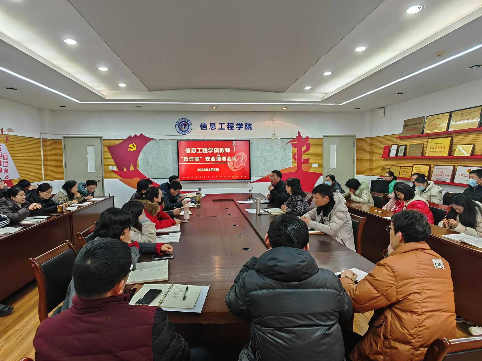 3月5日中午全体教师会上,党总支安排陈夺对信息工程学院全体教师进行了反诈防骗宣传培训,会议部署了“学院领导-授课老师-班级辅导员”三级联动机制,学院领导进一步压实主体责任,提高重视程度,主动深入课堂和宿舍宣传引导,关注诈骗案件频发班级,敦促总结经验教训并及时整改;教师层面要结合学校要求,一个班不漏的开展专题防骗教育,并将反诈防骗教育融入课程思政,利用课前、课中、课后,教育和引导学生认清诈骗套路,谨防上当受骗;辅导员层面要创新工作方法,主动了解各种诈骗方式和防骗技巧,多措并举提升学生反诈意识,设立反诈安全员,监督室友日常网络行为,发现异常及时上报。