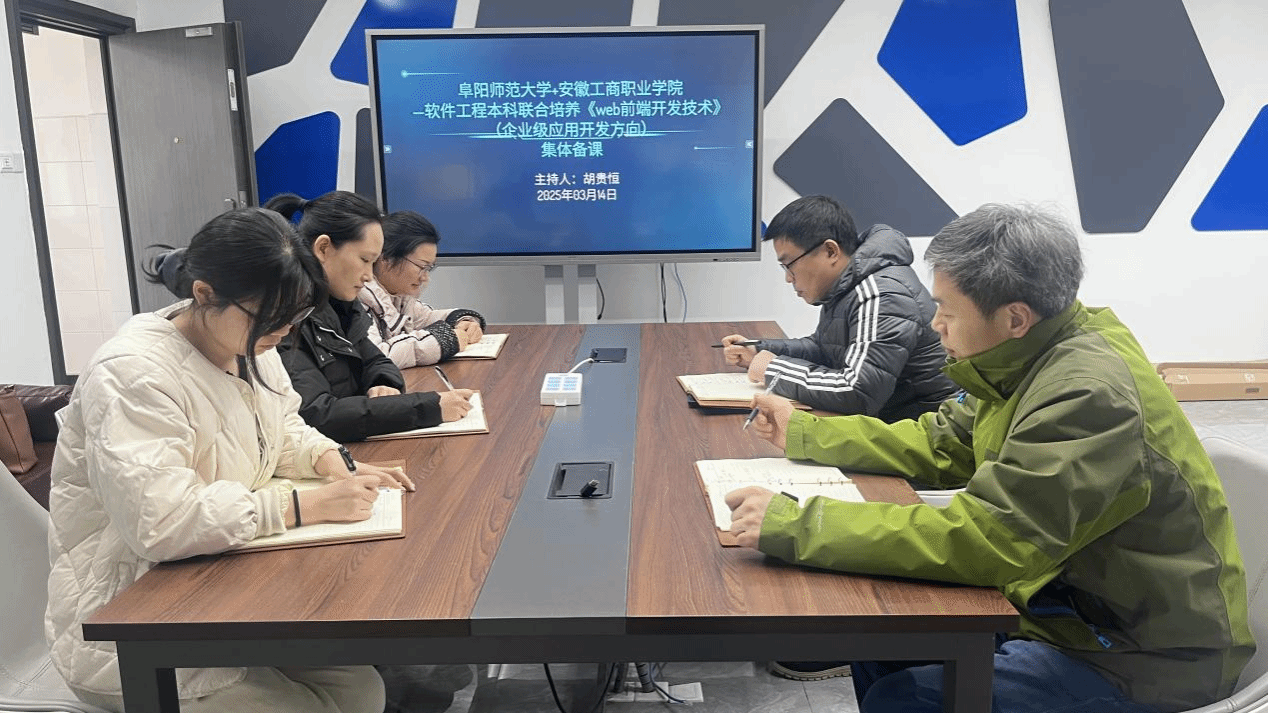 2025年3月14日中午,阜阳师范大学与安徽工商职业学院联合培养软件工程本科班《WEB前端开发技术》集体备课研讨会在人工智能工作室召开。本次会议旨在进一步优化课程教学内容与方法,提升教学质量,为学生提供更优质的教育体验。阜阳师范大学张岩教授及软件教研室相关教师参加了此次研讨会。