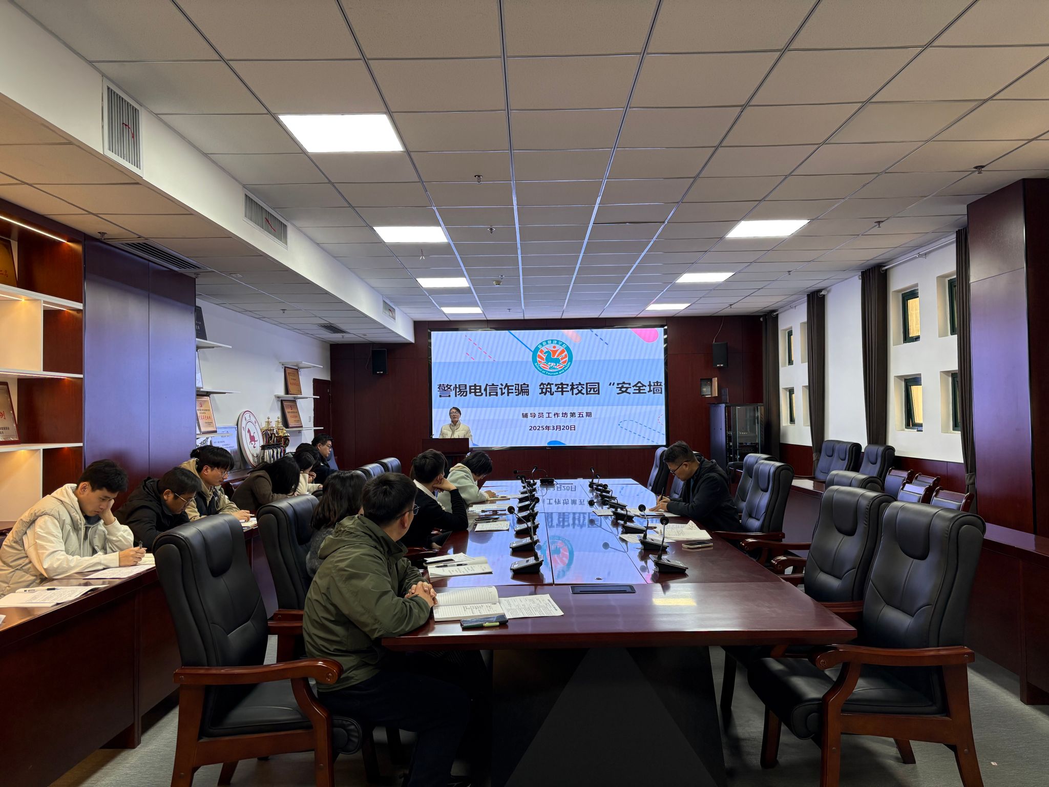 为进一步加大安全教育力度,提高学生反诈防骗的意识,3月20日中午,旅游健康学院在学院会议室开展了“警惕电信诈骗,筑牢校园安全墙”为主题的辅导员工作坊交流活动,学院党总支书记杨锐、全体专兼职辅导员参会,党总支副书记刘燕做主题分享。