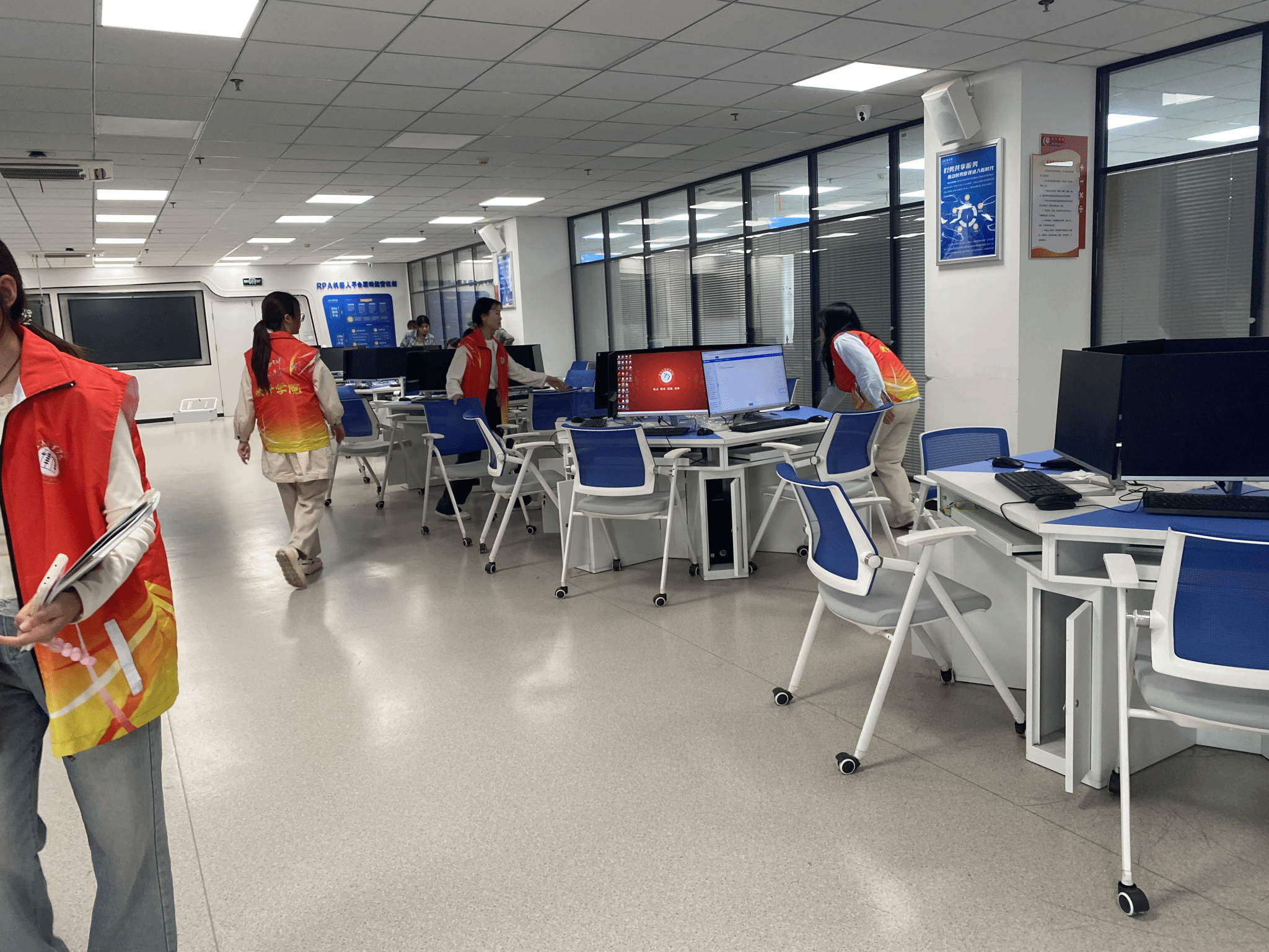 活动中,领队老师简短明了地讲解了注意事项并分配了任务后,学生党员们即刻投身到清洁工作中。实训室里,志愿者的身影忙碌而有序,他们遍布在各个角落。一部分志愿者手握抹布,一丝不苟地擦拭着电脑和桌面,确保每一处都光洁如新;另一部分志愿者则挥动着扫帚,细心清扫着地面的每一个角落,不放过任何一丝尘埃。大家齐心协力,共同为实训室营造了一个干净整洁的学习环境。