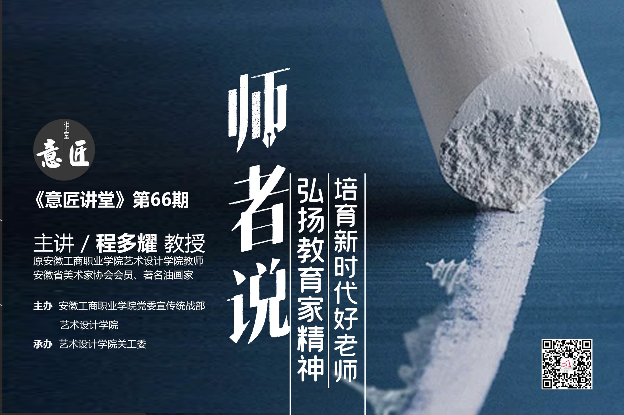 4月18日下午,安徽工商职业学院【第六十六期意匠讲堂】《弘扬教育家精神,培育新时代好老师》在庐阳校区开讲。本期讲堂特邀艺术设计学院关工委委员、退休教师程多耀教授担任主讲,为青年教师带来一堂饱含历史温度与时代使命的专题讲座。学院青年教师、全体专兼职辅导员参加了本次讲堂。学院党总支副书记张乐主持讲座。