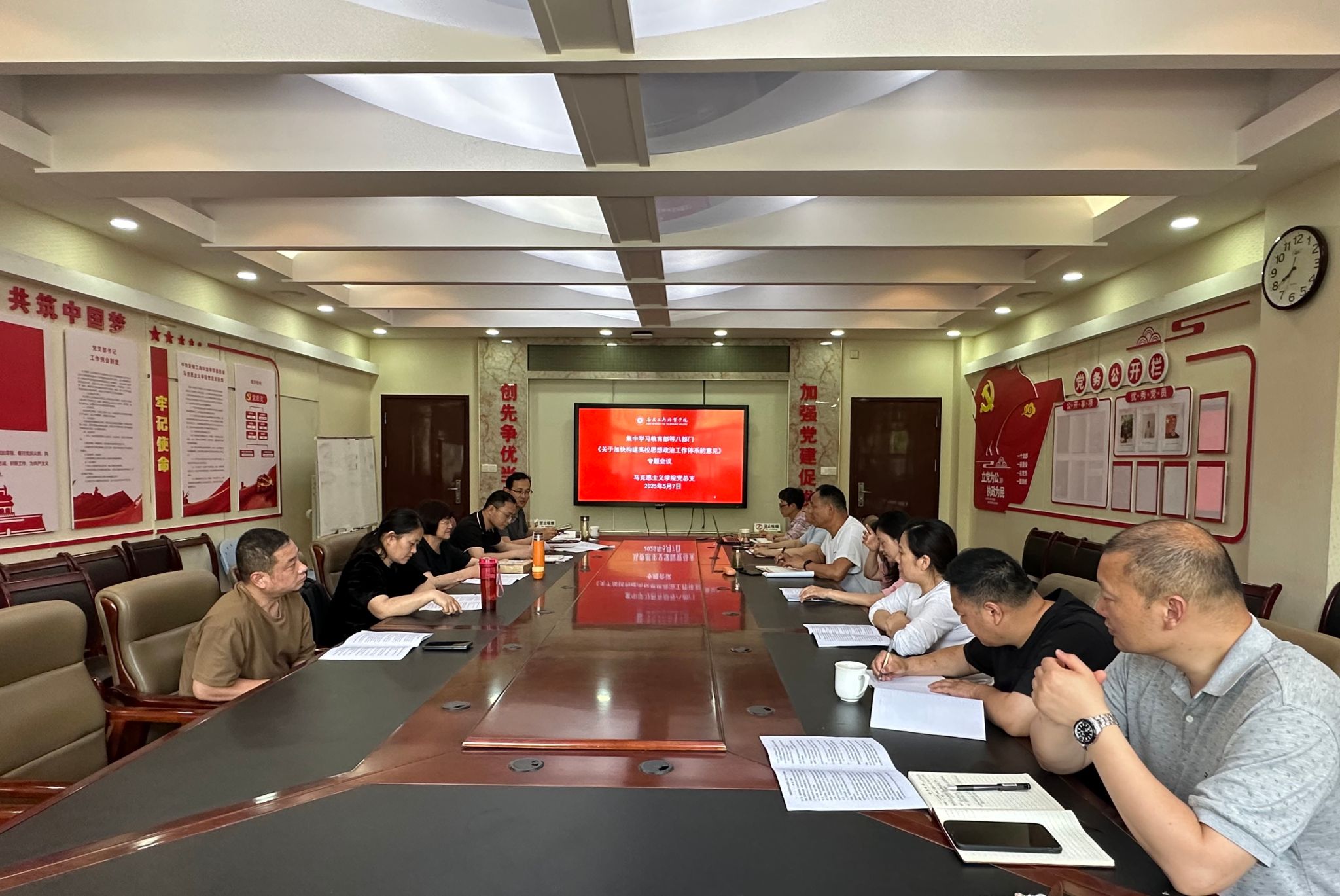 5月7日,马克思主义学院党总支在明德楼1号会议室召开理论学习中心组(扩大)学习会,集中学习教育部等八部门《关于加快构建高校思想政治工作体系的意见》。全体党总支成员、各支部书记、部分教师代表参加学习,会议由党总支书记葛成飞主持。