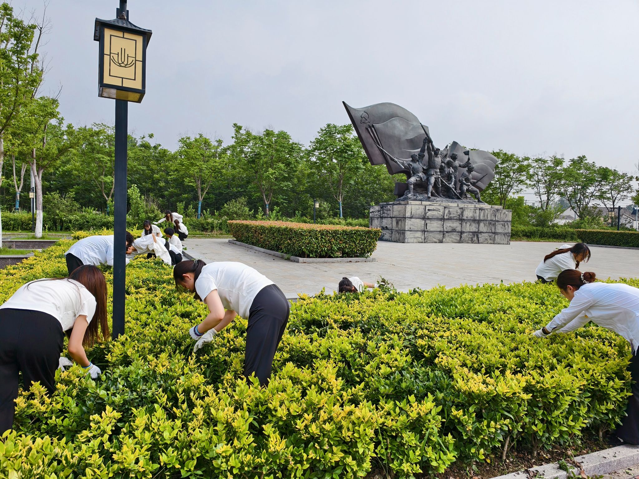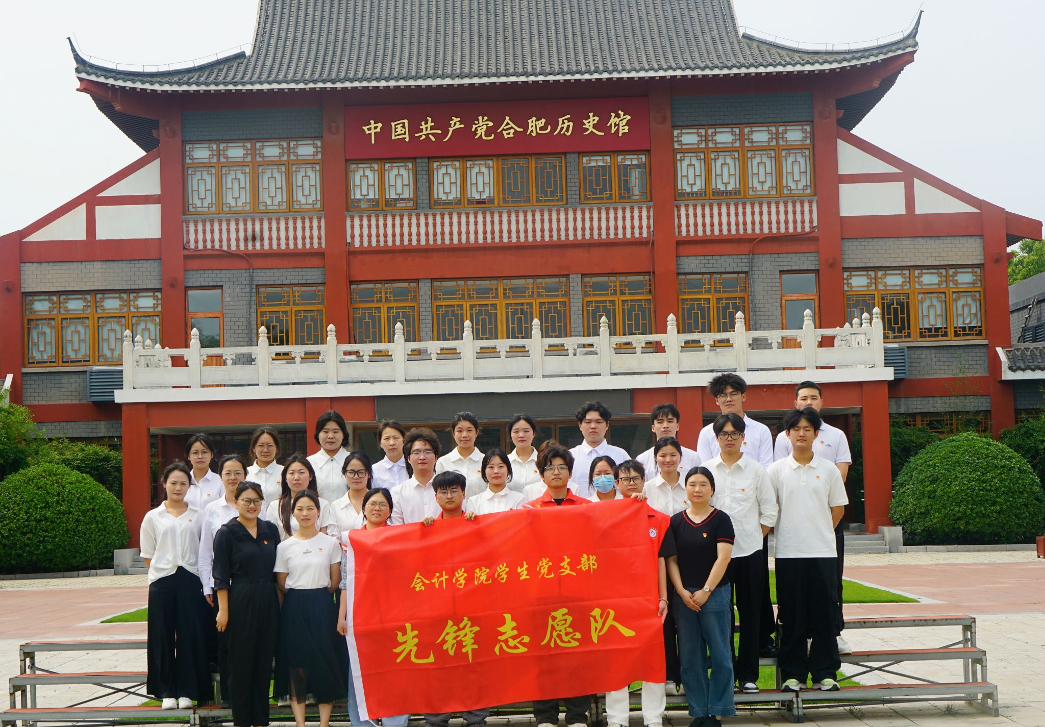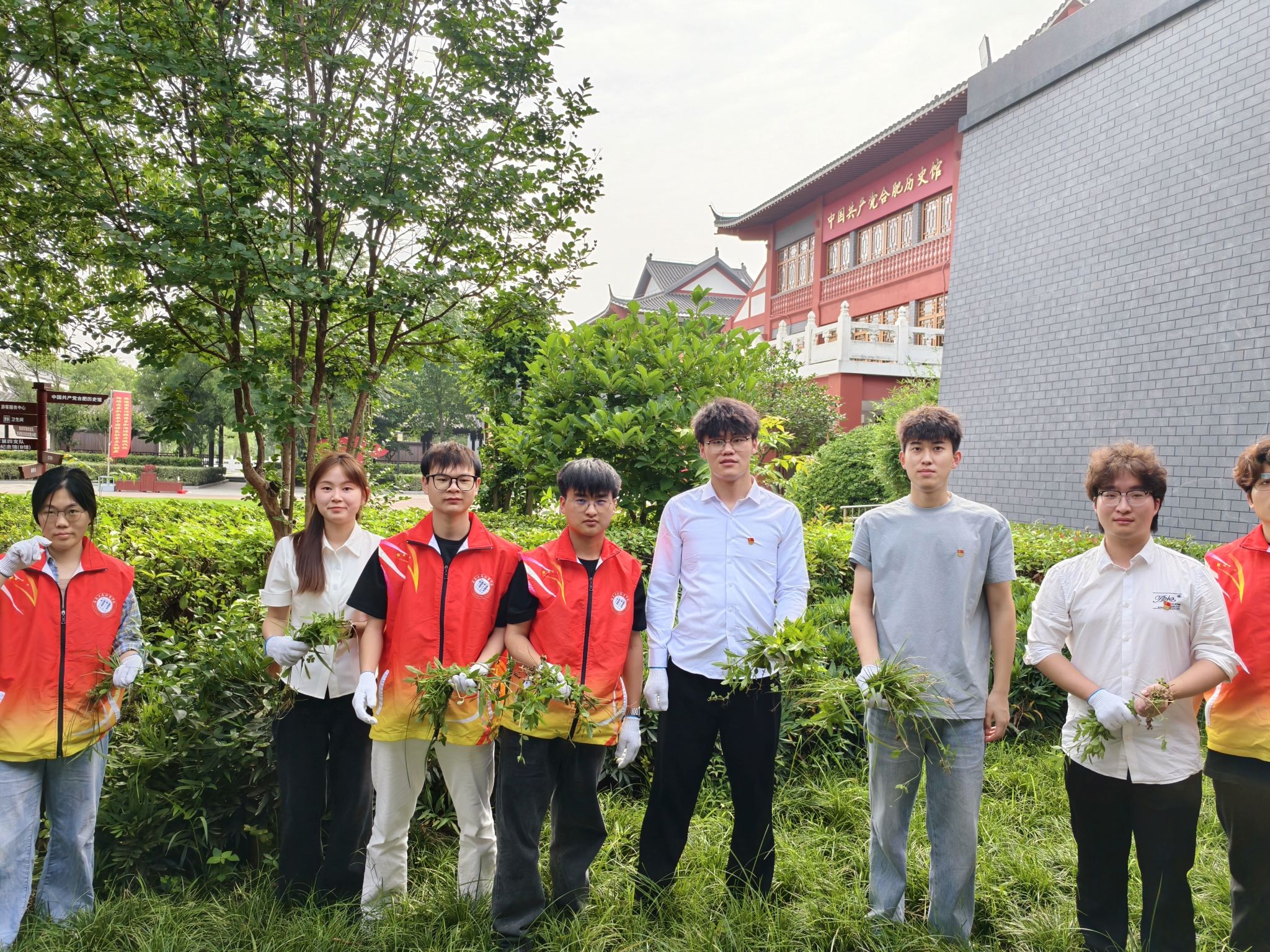6月11日,会计学院党总支组织学生党支部先锋志愿队走进合肥党史馆,开展“拔草护绿勇担使命,先锋行动共筑新风”志愿服务活动。36名学生党员及入党积极分子以劳动为笔、汗水为墨,在党史馆周边描绘出一幅青春奉献的红色画卷,用实际行动诠释新时代青年党员的责任担当。