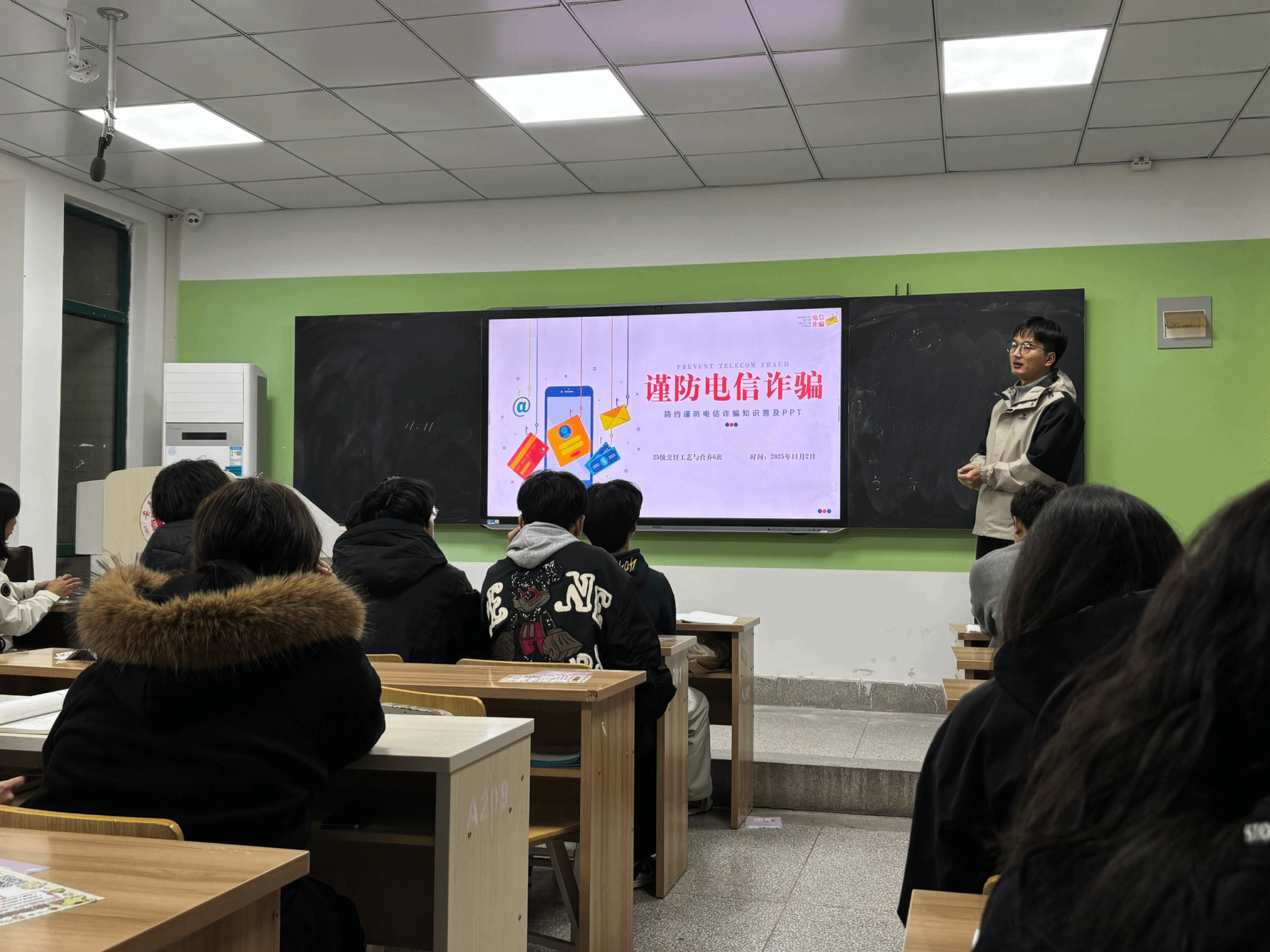 共筑安全防线,建设和谐校园:班会重点开展了校园安全知识学习,结合典型案例,讲解了防范电信诈骗以及实验实训安全等注意事项,从遵守宿舍管理规定、维护公共秩序等身边事做起,共同参与平安校园建设。