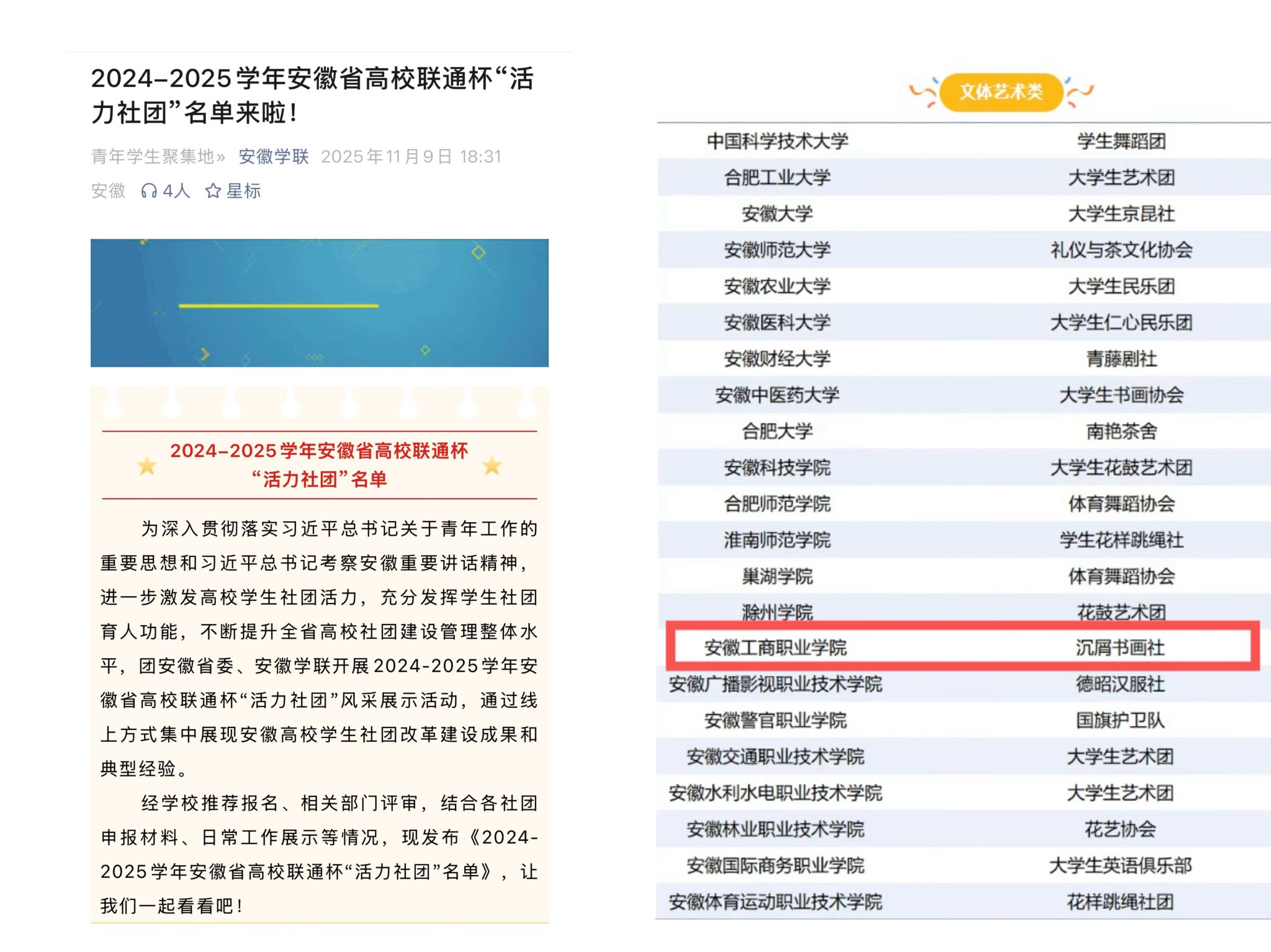 我校沉屑书画社入选2024-2025学年安徽省高校联通杯“活力社团”榜单