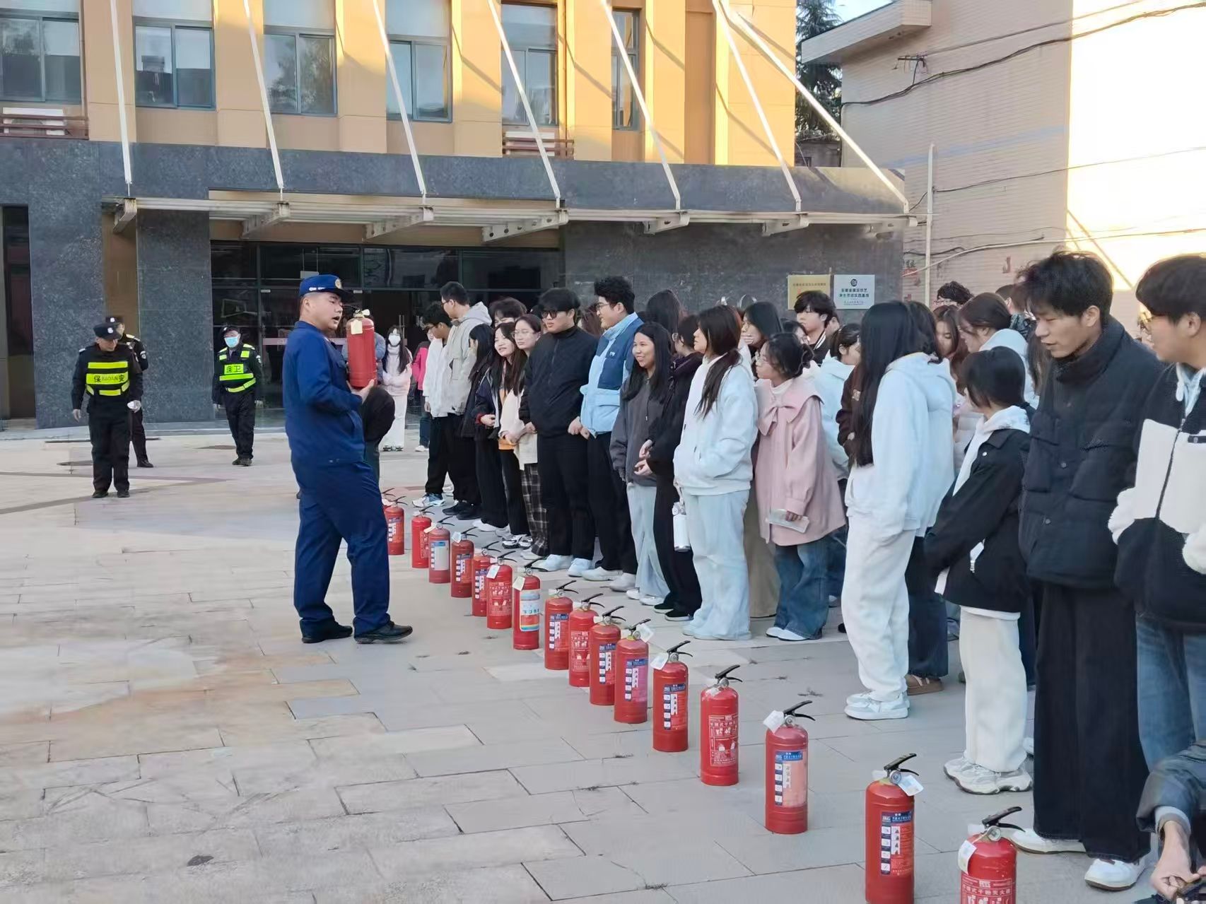 实操环节。消防员在致知楼广场现场示范了灭火器“提、拔、握、压”操作要领,并组织师生分组进行实操演练。大家踊跃参与,在消防员的指导下亲身体验灭火过程,切实掌握了基本灭火技能。此外,消防员还现场解答师生关于消防安全的疑问,进一步丰富了师生的消防知识储备。