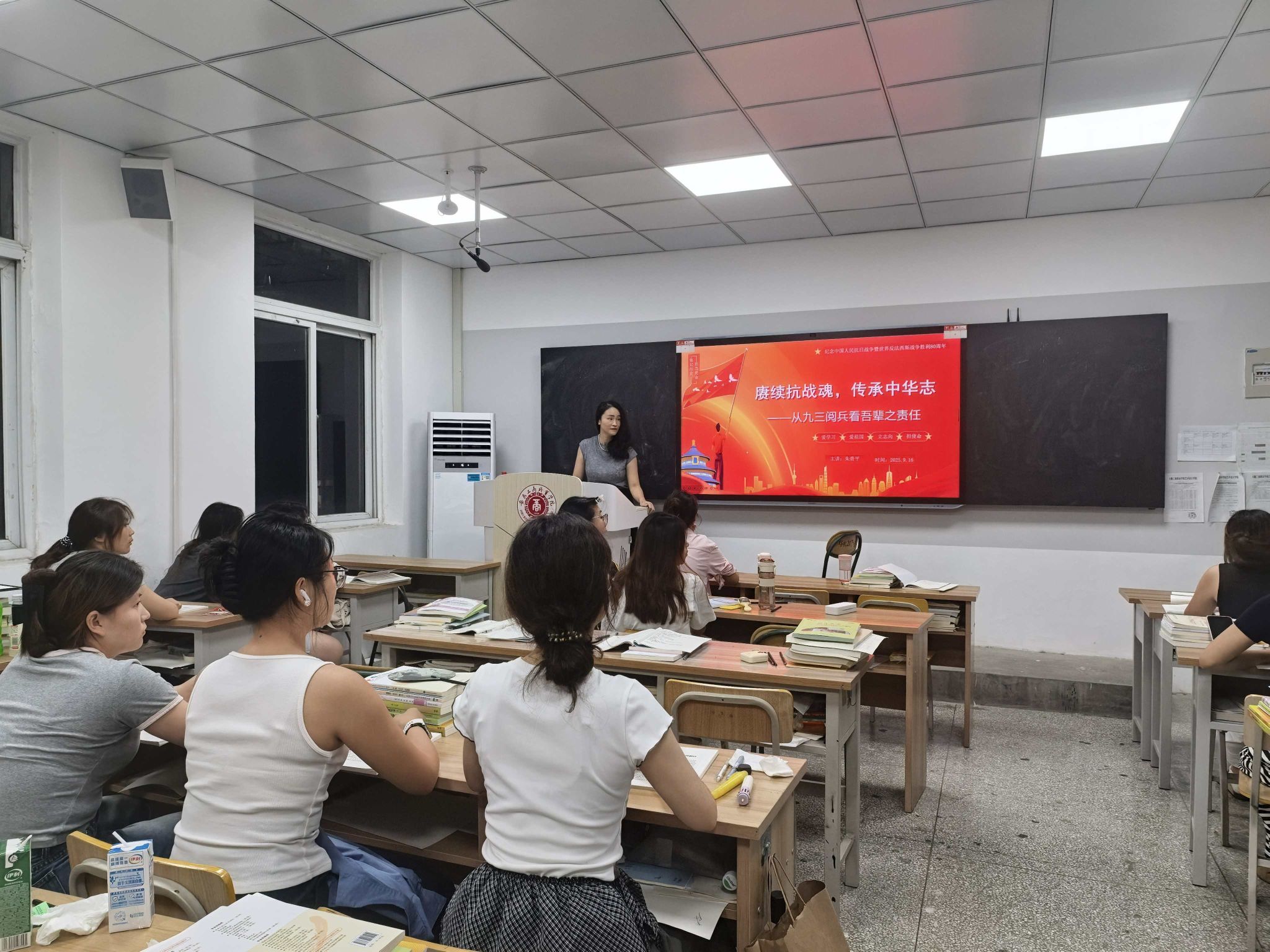 爱国铸魂,传承红色基因。学院以纪念中国人民抗日战争暨世界反法西斯战争胜利80周年等重要节点为契机,组织思政课教师深入学生社区,开展“铭记抗战史,筑牢安全线”“赓续抗战魂,传承中华志”等主题教育活动。通过回顾抗战历史、讲述英雄事迹、解析时政热点,引导学生深刻认识民族命运的起伏与复兴,领会抗战精神的当代意义,增强“国家安全,人人有责”的使命意识,自觉将爱国之情转化为报国之行。