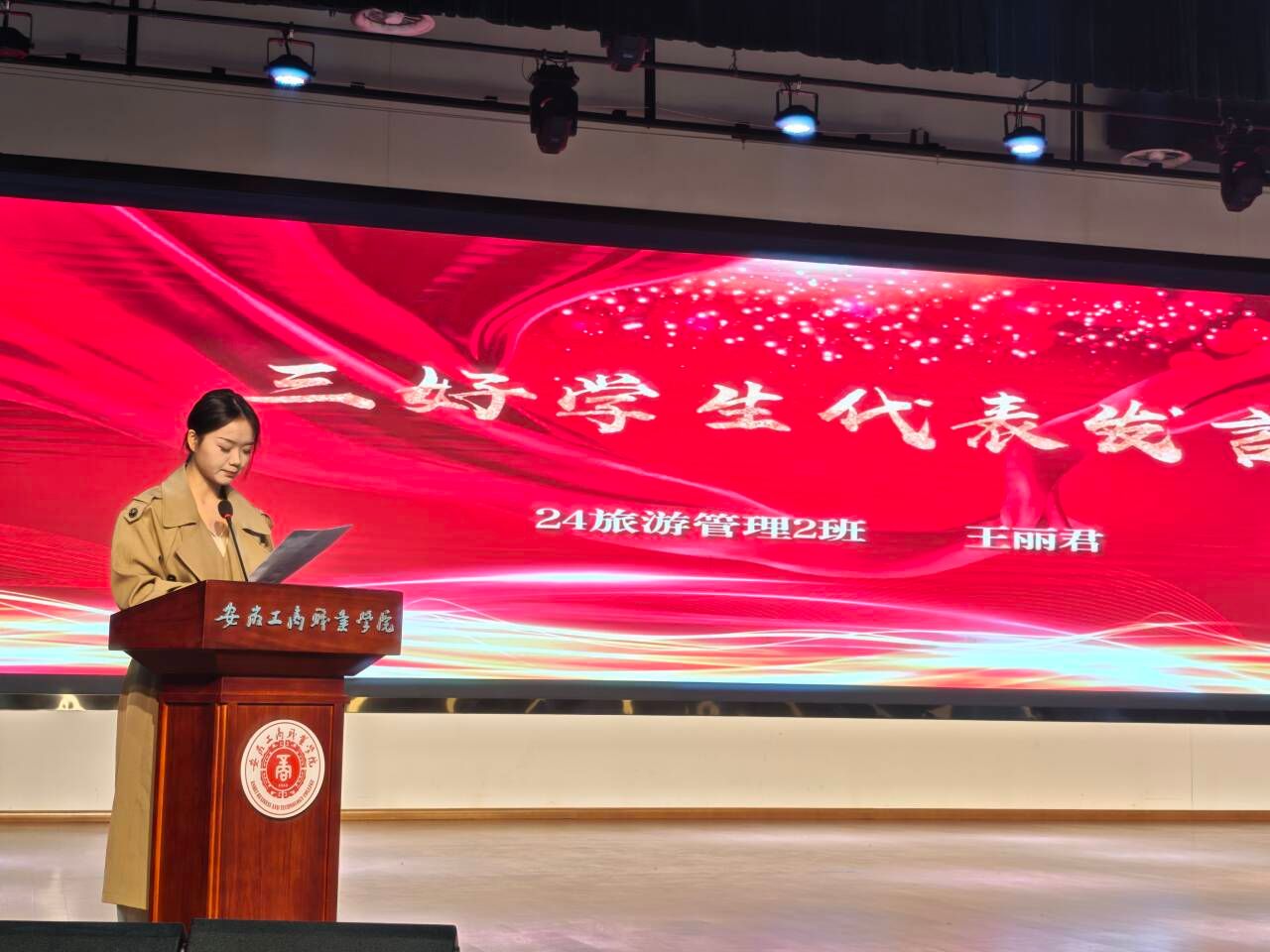 随后,23健身指导与管理2班孔可璐同学作为2025年度国家奖学金获奖代表发言,她回顾了自己入学以来的点点滴滴,分享了如何从最初的懵懂无知到如今自信自强,一路有欢声与笑语,有辛酸与泪水,她鼓励同学们努力就有回报,愿同学们都能不负自己最好的青春。24烹饪工艺与营养2班郝静怡同学作为世界技能大赛获奖代表发言,她回顾了自己参加技能大赛、学科竞赛、职业规划大赛等赛项的经历,分享了自己的心得与体会,她希望同学们钻研专业知识,提高专业技能,朝着大国工匠、能工巧匠的目标而努力奋斗。 24级旅游管理2班王丽君同学作为学校三好学生代表发言,她表示,大学生活是充满挑战和机遇的,在这里,我们不仅学到了丰富的专业知识,更在思想、能力和综合素质上得到了全方位的提升。每一次的课堂讨论、每一次的社团活动、每一次的志愿服务,都是我们成长的宝贵经历。