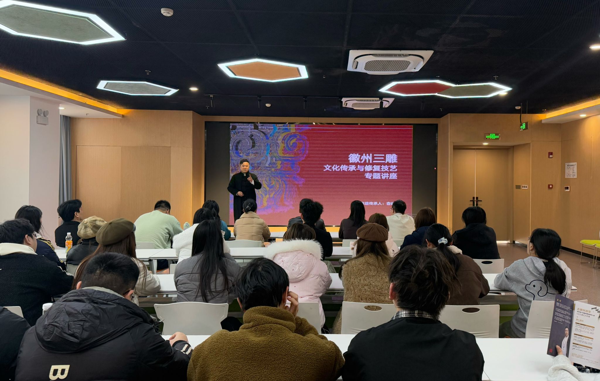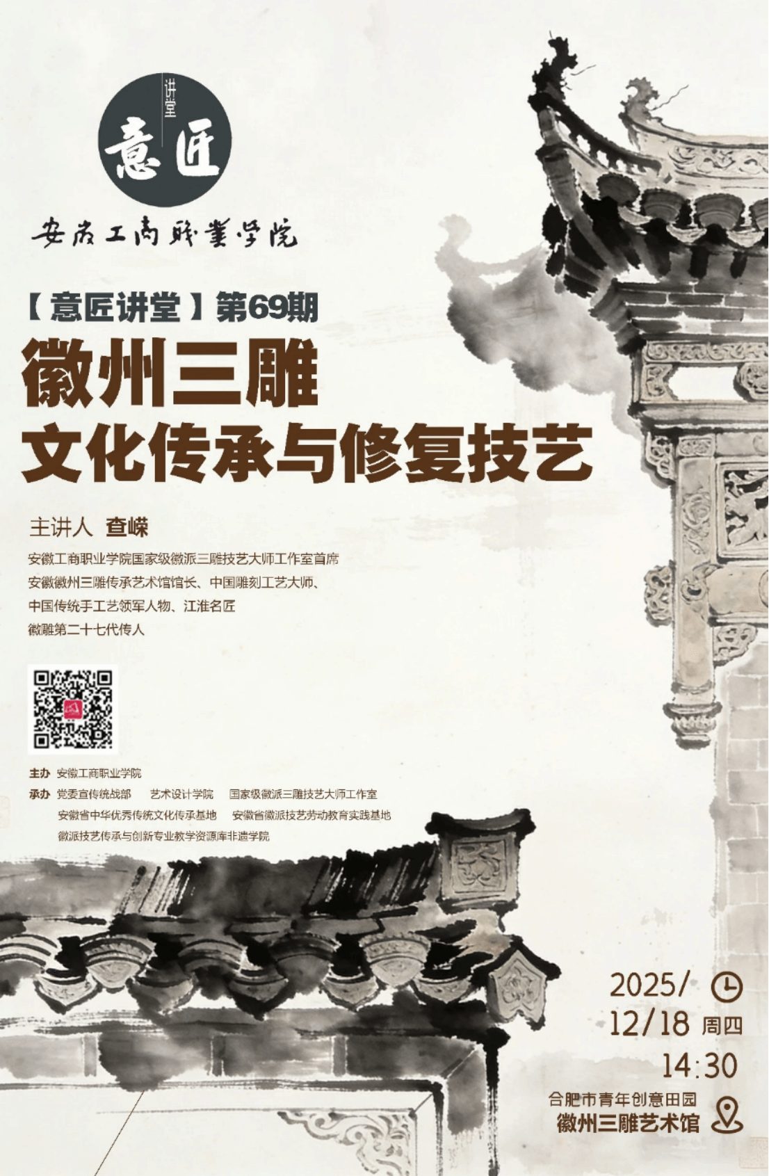 2025年12月18日下午,安徽工商职业学院第六十九期“意匠讲堂”在合肥·青年创意田园徽州三雕艺术馆拉开帷幕。本期特邀学院徽派三雕技艺大师工作室首席、徽州三雕传承艺术馆馆长、中国雕刻工艺大师、江淮名匠、徽雕第二十七代传人查嵘先生担任主讲。艺术设计学院院长魏芬、副院长邱志斌、教务科长张翌、部分教师及2024级各班的学生代表共同参加了本次讲座。