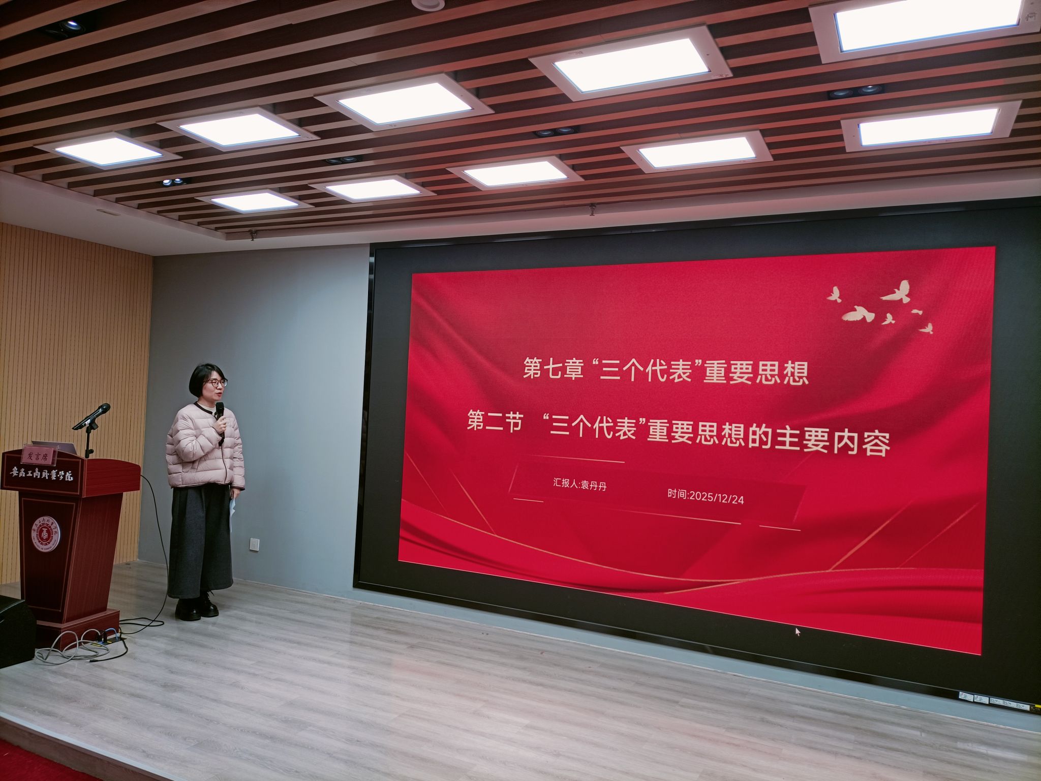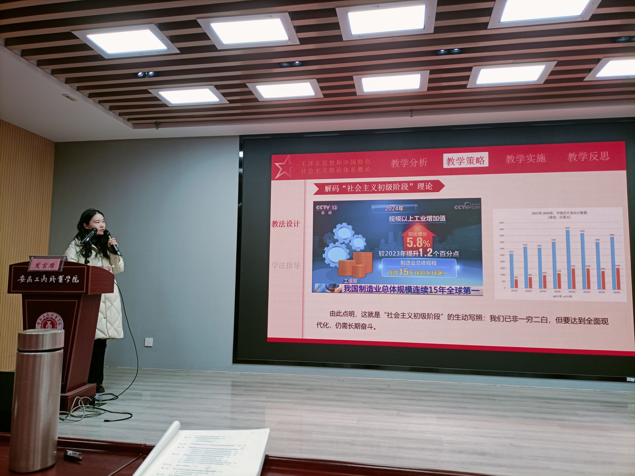 袁丹丹老师主要围绕教材中“三个代表”重要思想的主要内容,从教学方法、教学过程等六个方面展开备课。袁老师注重教学方法和教学手段的创新,紧密联系学生和社会实际,就如何讲深讲透“三个代表”重要思想的主要内容做了全面的剖析,其中就如何讲好发展是党执政兴国的第一要务做了重点讲解。