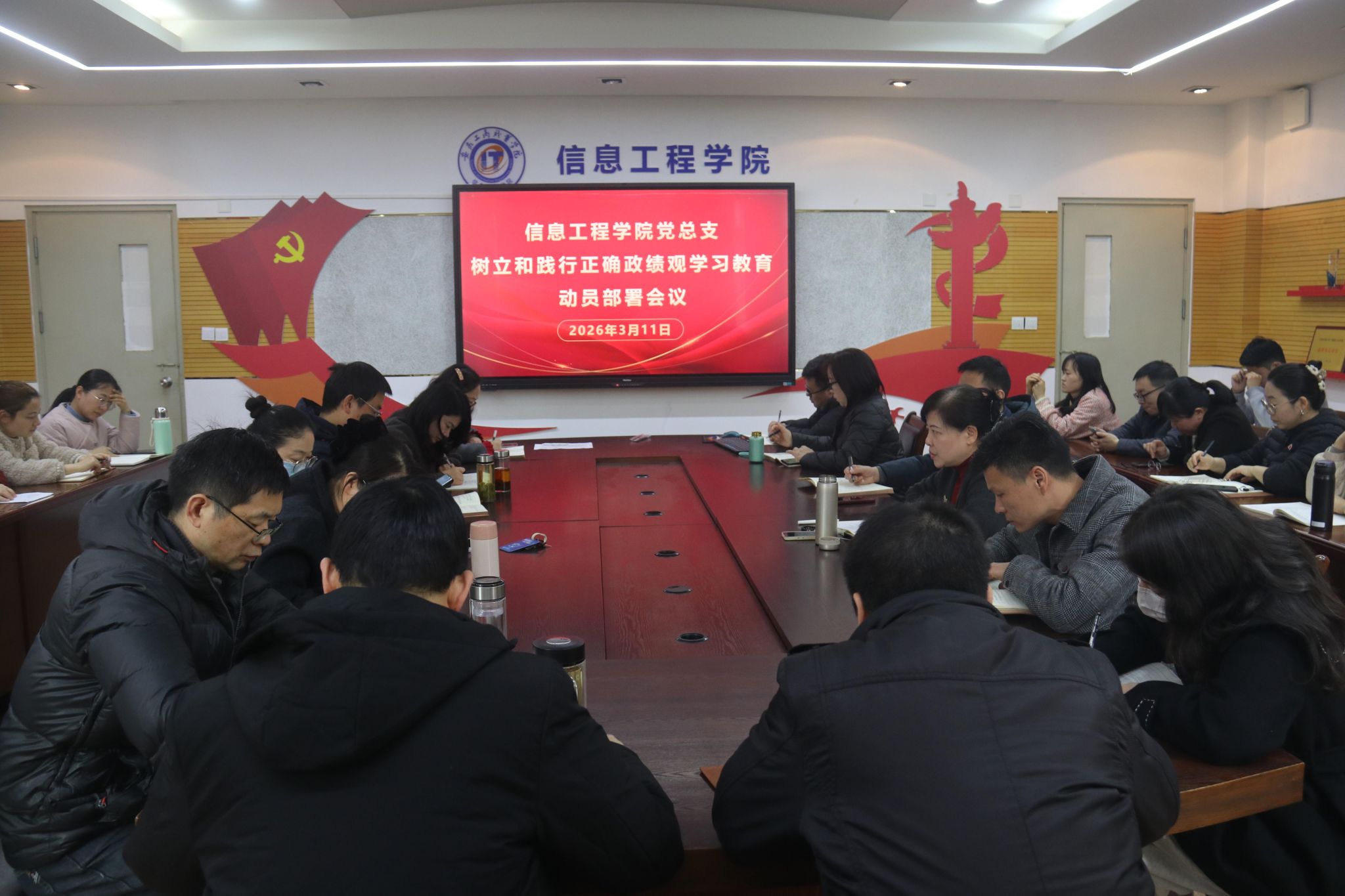 3月11日中午,信息工程学院党总支在党员活动室召开树立和践行正确政绩观学习教育动员部署会议,党总支书记张静雯主持会议,党总支副书记、院长范生万,副书记陈夺,副院长黄梅娟及全体教师党员参会。