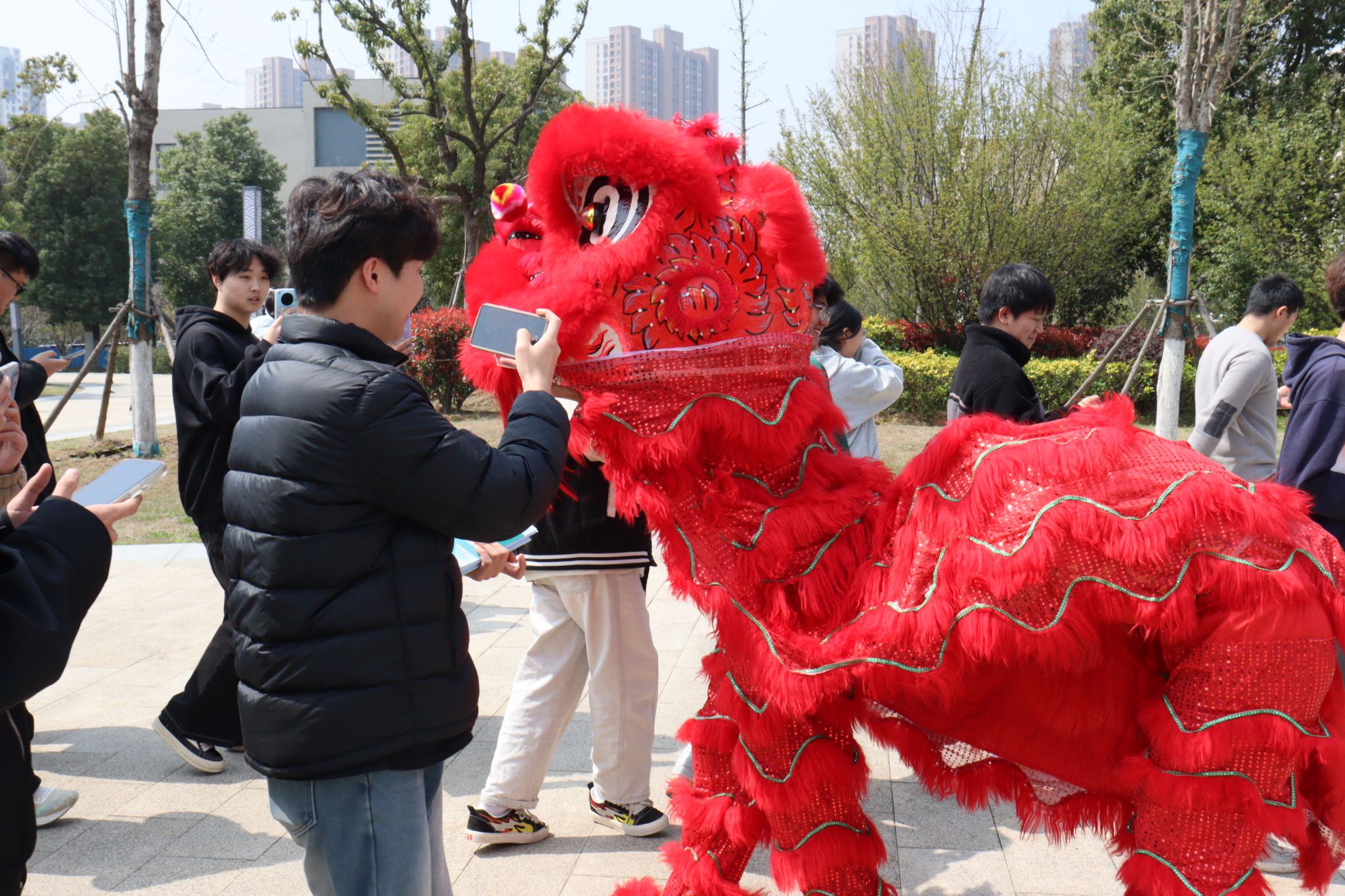活动在激昂的锣鼓声中拉开帷幕。来自寻氧体育协会的舞狮队以“采青”“腾跃”等经典动作惊艳全场,灵动的身姿与师生们的喝彩声交织成一片欢乐的海洋。表演间隙,舞狮队员现场教授基础步伐,数十名师生踊跃体验,在挥汗如雨中感受“台上一分钟,台下十年功”的匠心精神。参与者表示:“亲手托起狮头才明白,非遗传承不仅是技艺的延续,更是坚韧品格的传递,这与雷锋‘干一行爱一行’的钉子精神高度契合。”