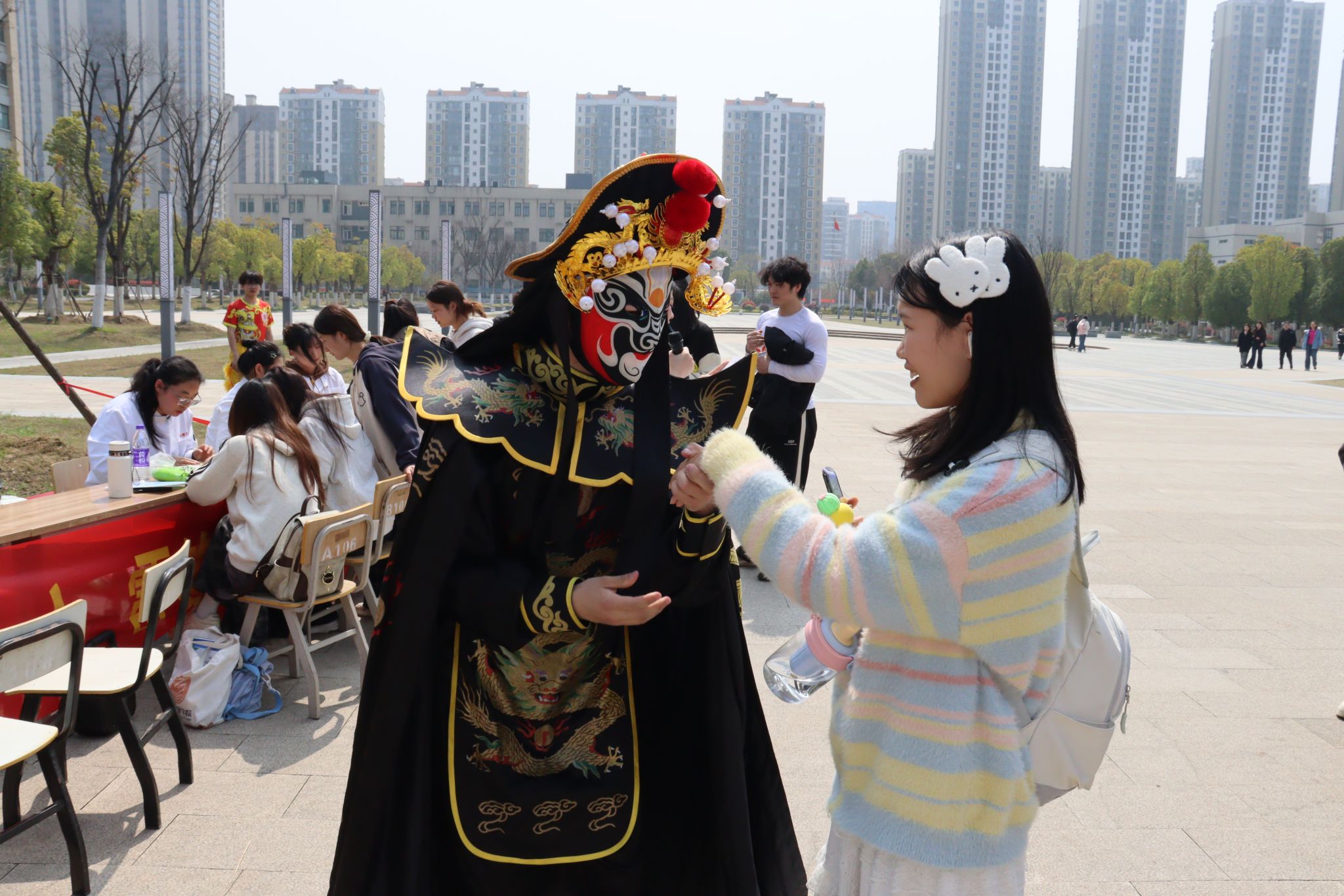 川剧变脸以“瞬息万变”的绝技点燃全场热情,随着鼓点节奏,演员在转身、甩袖间变幻十余张色彩斑斓的脸谱,时而威严、时而诙谐,配合“吐火”特技更引得师生连连惊叹。