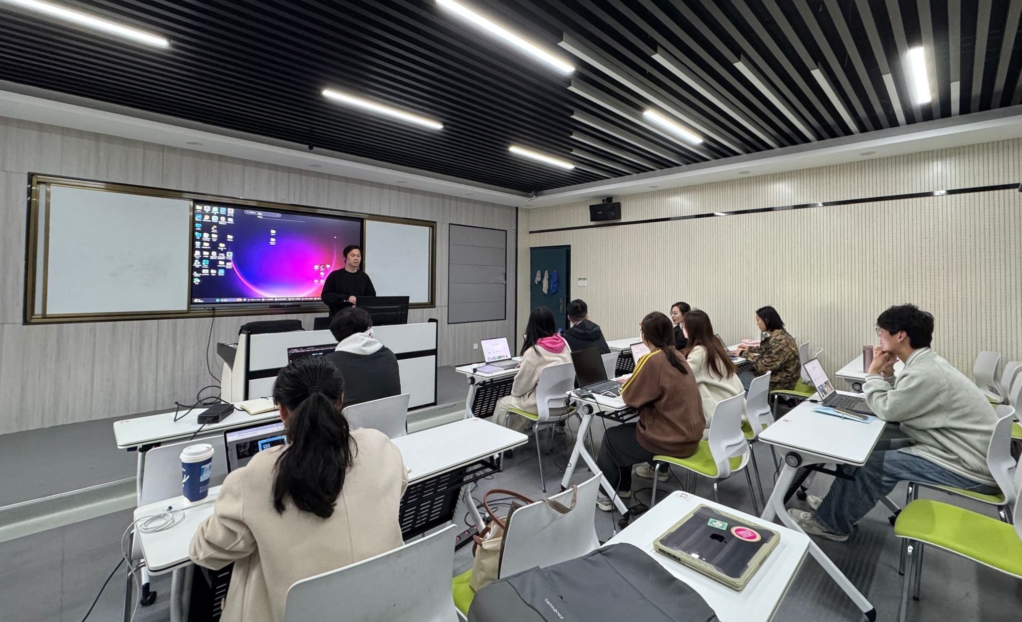 艺术设计学院广告艺术设计微短剧创作团队范韬、万嘉琪、吴昊、刘涵与同学们共同参加研讨。万强导演及其创作团队结合自身多年微短剧创作经验,围绕AIGC微短剧的发展现状、创作逻辑、技术应用及行业痛点展开分享。