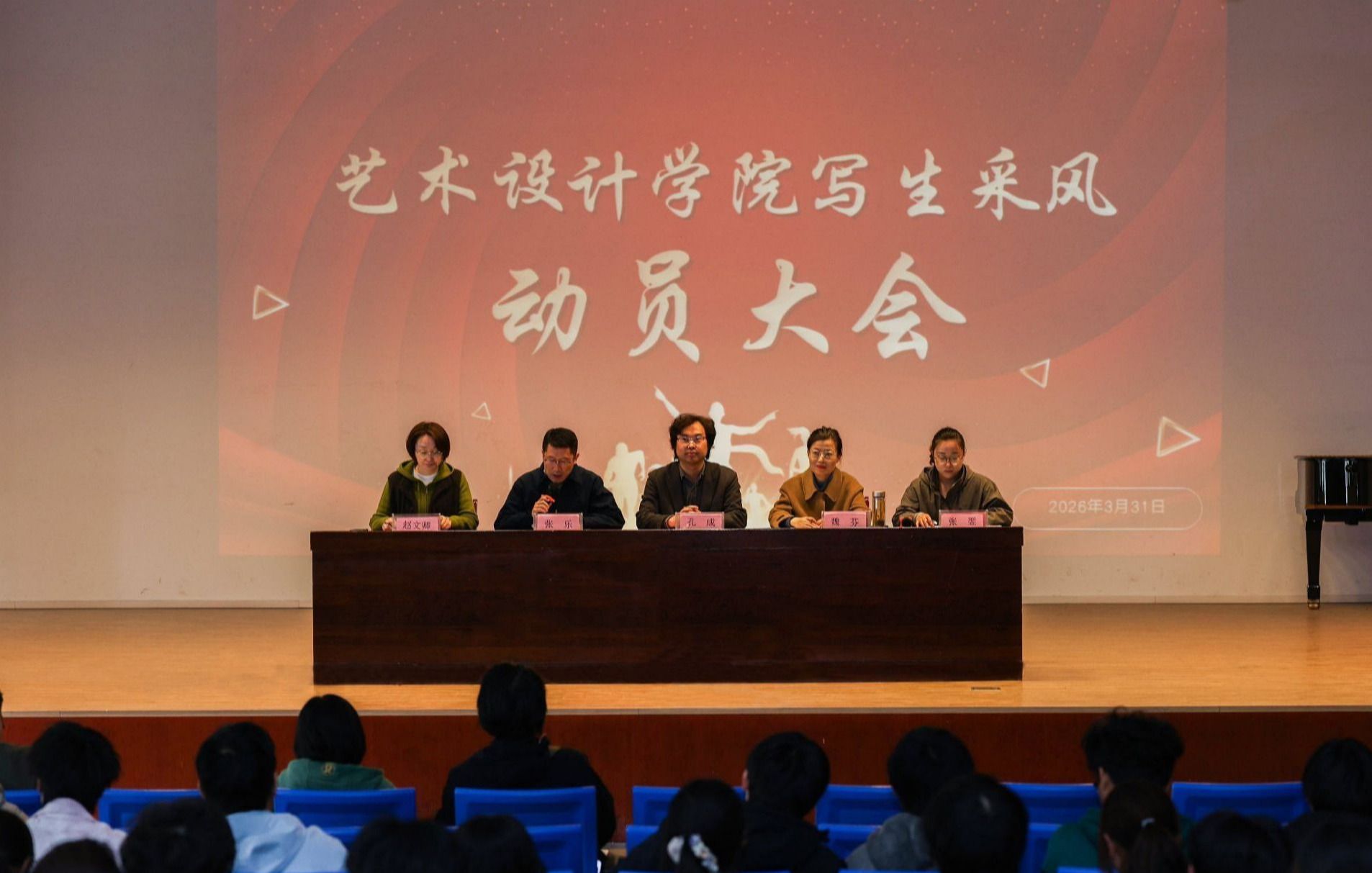 为切实落实人才培养方案,深化实践教学改革,3月31日下午,艺术设计学院2026年春季写生采风动员会在学院时间剧场召开。校党委委员、党委宣传统战部部长、艺术设计学院党总支书记孔成,艺术设计学院党总支副书记、院长魏芬,艺术设计学院党总支副书记张乐,艺术设计学院教务科、学生科负责人,授课教师以及2025级写生学生参加会议。会议由张乐主持。