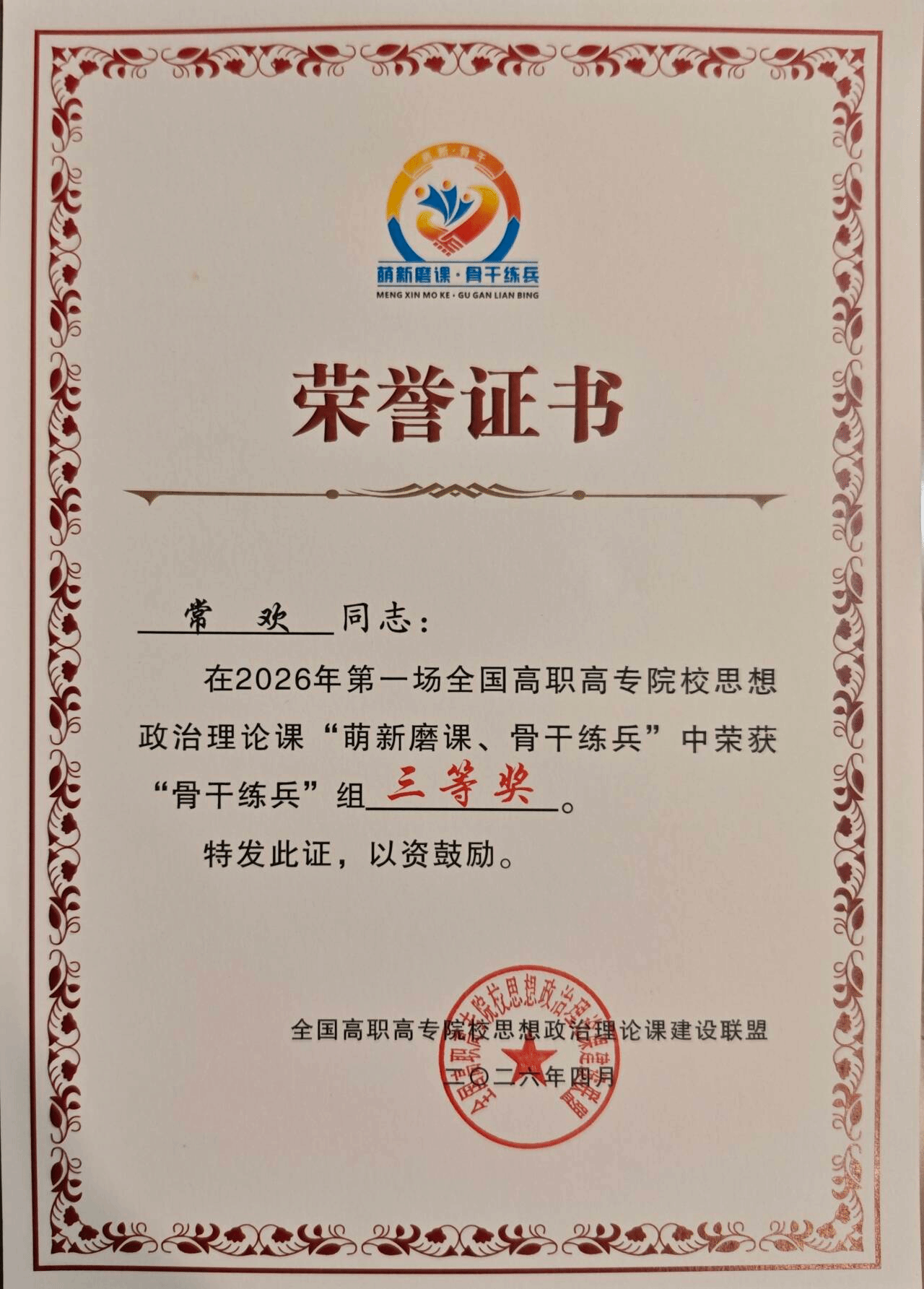近日,2026年第一场全国高职高专院校思想政治理论课“萌新磨课、骨干练兵”评选活动结果揭晓,马克思主义学院教师常欢荣获《思想道德与法治》课程“骨干练兵”组三等奖。