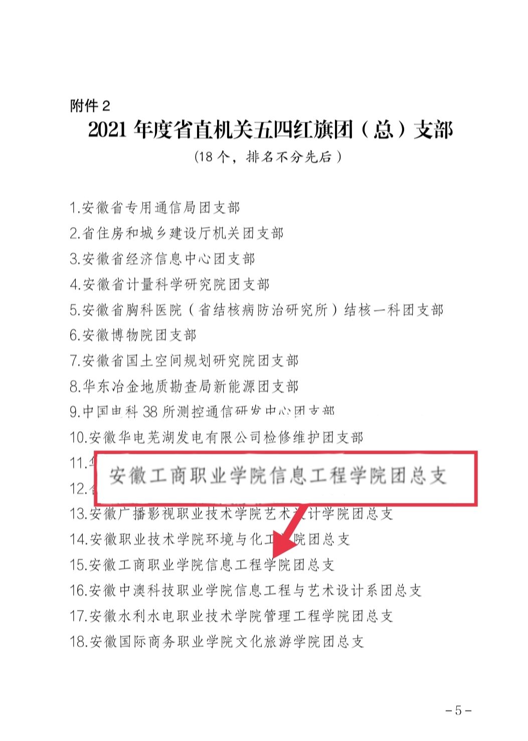 近日,共青团安徽省直机关工委发布《关于表彰命名2021年度省直机关“五四红旗团委“五四红旗团(总)支部”“优秀青年理论学习小组”和“青年学习标兵”的决定》通知,对2021年度省直机关各级共青团组织和广大团员青年中涌现出的先进集体和个人进行集中表彰,安徽工商职业学院信息工程学院团总支荣获省直机关“五四红旗团总支”荣誉称号。