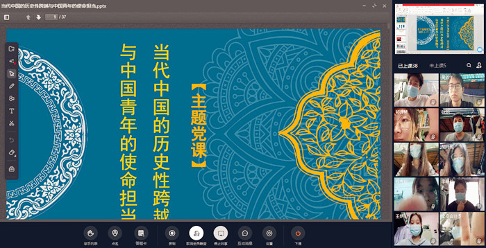 为积极引导学生党员认识并积极履行当代青年的使命担当,会计学院学生第一党支部于4月13日利用钉钉群直播方式开展了“当代中国的历史性跨越与中国青年的使命担当”线上专题党课,本次党课由支部书记余想花主讲,支部在校师生党员参与了学习。