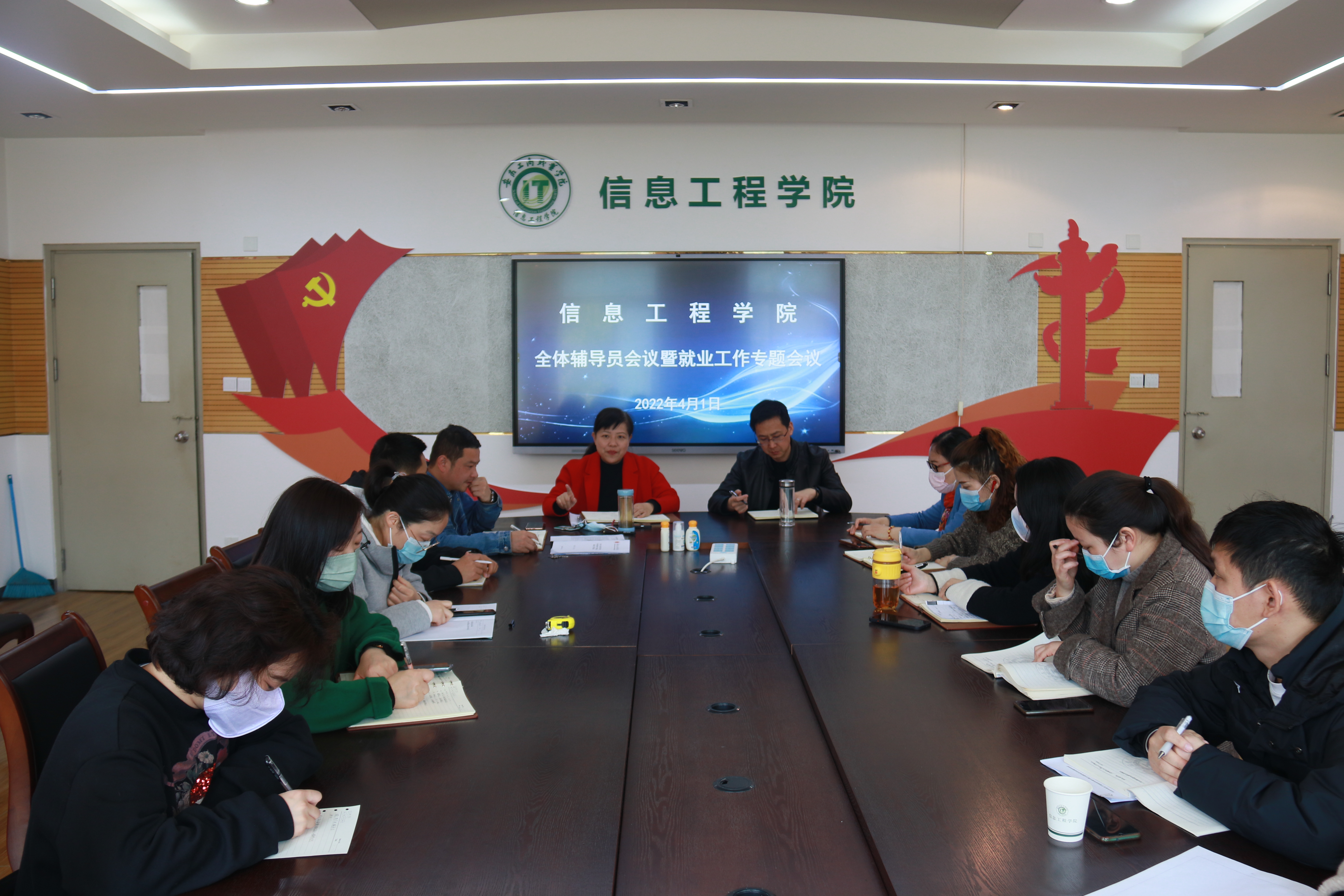 为全面落实校园疫情防控期间相关管理规定,进一步做好学生管理各项工作,推动我院2022届毕业生就业工作,4月1日中午,信息工程学院在307会议室召开辅导员工作会议暨学院就业工作专题会议,本次会议采取线上线下相结合的方式开展,信息工程学院院长范生万及学院全体辅导员参加会议,会议由信息工程学院党总支书记张静雯主持。