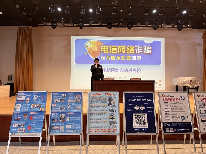 为减少和预防电信诈骗案件的发生,有效遏制网络违法犯罪,提高师生自觉防范电信网络诈骗意识,艺术设计学院联合杏林派出所于2月24日在礼堂开展了一场防电信诈骗宣传教育讲座。全体21级学生及部分老师参加了本次讲座。杏林派出所副所长侯勇带队,潘警官、王警官担任主讲人。