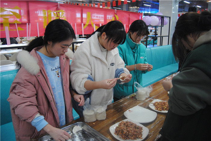 此次活动同学们热情高涨,积极参与。活动现场,调馅的调馅,和面的和面,擀皮的擀皮,大家分工明确,配合默契。校领导及老师们不仅教同学们如何包饺子,还和大家话家常、谈传统文化,欢笑声不断。