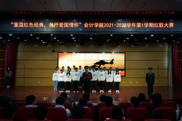 决赛现场共有来会计学院2021级新生班级的10支合唱队伍倾情演唱了《我的中国心》、《强军战歌》、《万疆》、《祖国不会忘记》等10首曲目。每只队伍演唱结束后,现场由5位评委打分,最终评出了一等奖1个,二等奖2个,三等奖3个,优秀奖4个。经过激烈的角逐,21级建设工程管理1班摘得本次比赛的桂冠,21大数据与会计4班、21工程造价2班荣获二等奖,21财税大数据应用1班、21大数据与会计12班、21工程造价1班荣获三等奖,21大数据与会计1班、21大数据与会计6班、21大数据与财务管理2班、21大数据与会计7班获得优秀奖。