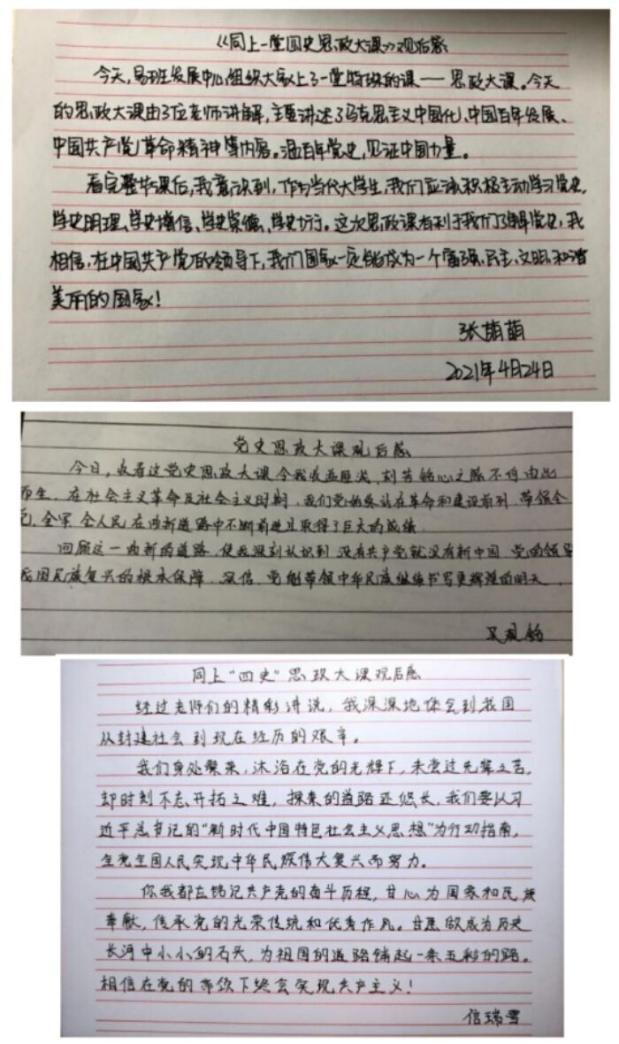 活动当天,全体学生助理统一着易班工作服,佩戴工作牌和口罩,认真观看直播课。课后展开激烈的讨论,并且撰写心得感悟。张萌萌同学在观后感中写到:“今天的思政大课由三位老师讲解,主要讲述了马克思主义中国化、中国百年发展、中国共产党革命精神等内容,温百年党史,见证中国力量!作为当代大学生,我们应该积极主动学习党史。历史是最好的教科书,也是最好的清醒剂!”吴观铭同学指出:“没有共产党就没有新中国!党的领导是我国民族复兴的根本保障。唯有党能带领中华民族继续书写更辉煌的明天!”信瑞雪同学表示:“我们身处繁荣,沐浴在党的光辉下,未尝过先辈之苦,却时刻不敢忘开拓之难。我们要以习近平新时代中国特色社会主义思想为行动指南,传承党的光荣传统和优良作风。”