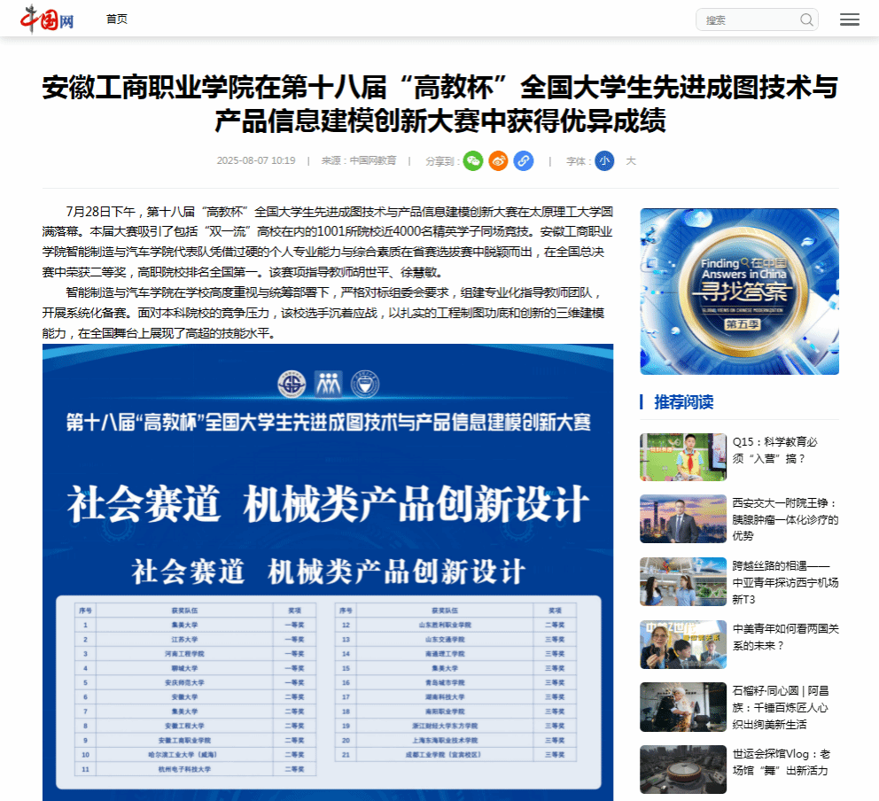 原文链接:【中国网】报道;安徽工商职业学院在第十八届“高教杯”全国大学生先进成图技术与产品信息建模创新大赛中获得优异成绩