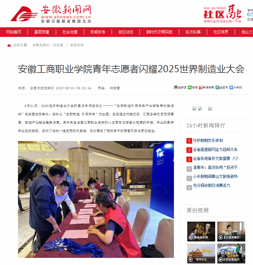 原文链接:【安徽新闻网】报道:安徽工商职业学院青年志愿者闪耀2025世界制造业大会