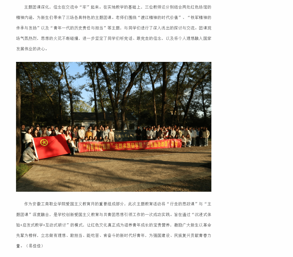 原文链接:【安徽新闻网】报道:传承红色基因 厚植爱国情怀——安徽工商职业学院团委开展“我爱我的祖国”主题实践研学暨“行走的思政课”活动