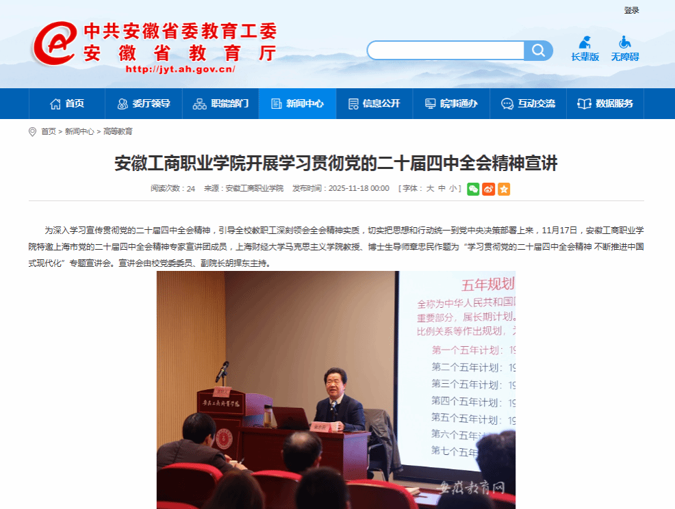 原文链接:【安徽教育网】首页报道:安徽工商职业学院开展学习贯彻党的二十届四中全会精神宣讲